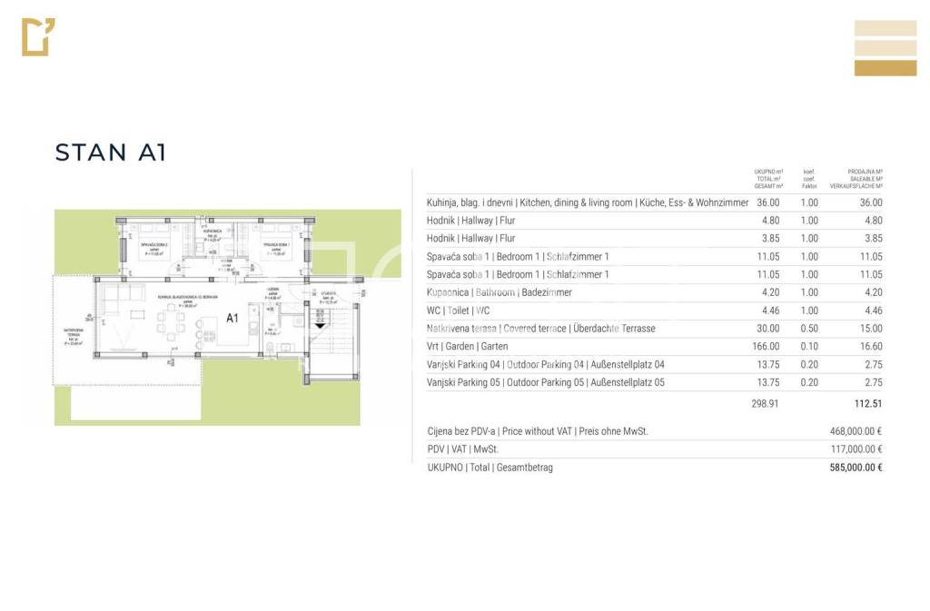 Nur 7 Autominuten von Zadar und 10 Minuten vom Flughafen entfernt liegt Sukošan, einer der gefragtesten Orte zum Leben und Investieren an der kroatischen Küste. Ausgezeichnete Verkehrsanbindung, eine gut ausgebaute Infrastruktur und die Nähe zum Meer machen es zur idealen Wahl für alle, die eine Kombination aus entspannter mediterraner Umgebung und modernem Komfort suchen. In einem ruhigen Teil von Sukošan, umgeben von jahrhundertealten Olivenhainen und Grünflächen, befindet sich das Projekt Olive Tree – ein Komplex aus drei eleganten Gebäuden, die sich perfekt in die natürliche Landschaft einfügen. Jede Wohnung bietet ein hohes Maß an Privatsphäre, viel Licht und einen Blick, der sich bis zum Archipel von Zadar erstreckt. Luxuriöse Dreizimmerwohnung A1 im Erdgeschoss des Olive Tree A Gebäudes. Die Wohnung besteht aus: Küche mit Essbereich und Wohnzimmer (36 m2), Flur (4,80 m2), Flur (3,85 m2), Schlafzimmer 1 (11,05 m2), Schlafzimmer 2 (11,05 m2), Badezimmer (4,20 m2), WC (4,46 m2), überdachte Terrasse (15 m2), Garten (16,60 m2), Außenparkplatz 04 (13,75 m2), Außenparkplatz 05 (13,75 m2) mit einer Gesamt-Nutzfläche von 112,51 m2. Olive Tree A Gebäude - ein Raum der Stille, des Lichts und der unaufdringlichen Eleganz. Olive Tree A ist ein Wohngebäude, das für diejenigen geschaffen wurde, die Wert auf Raum, Ruhe und Luftigkeit legen. Es besteht aus drei exklusiven Wohnungen, die jeweils sorgfältig entworfen wurden, um maximalen Komfort, Privatsphäre und ästhetisches Erlebnis zu bieten. Große Terrassen mit Meerblick, viel Tageslicht und eine harmonische Beziehung zwischen Innen und Außen machen Olive Tree A zur perfekten Wahl für das Familienleben oder einen luxuriösen Rückzugsort aus der Hektik der Stadt. Das Projekt wurde nach den höchsten Standards gebaut - POROTHERM-Blöcke, STO-Fassade, REHAU-Tischlerei und Naturstein Römischer Travertin in Treppenhäusern und Balkonen. Im Innenraum dominieren mehrschichtiges Eichenparkett, Fußbodenheizung (DEVI), Bosch-Ausstattung in Küchen und Bädern sowie Mitsubishi-Klimaanlagen. Glasgeländer und dezente Ambientebeleuchtung unterstreichen zusätzlich die Eleganz des Raumes. Olive Tree ist mehr als eine Immobilie – es ist ein Lebensstil, der Schönheit, Funktionalität und langfristigen Wert vereint. Die Fertigstellung der Gebäude A und B wird für Ende Juli 2025 und die Fertigstellung des Gebäudes C für Anfang Juni 2026 erwartet. Der Preis der Wohnung inklusive Mehrwertsteuer beträgt 585.000 EUR Für weitere Informationen und Besichtigungen – kontaktieren Sie uns vertrauensvoll.