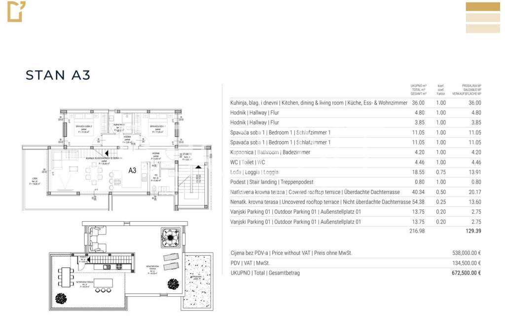 Nur 7 Autominuten von Zadar und 10 Minuten vom Flughafen entfernt liegt Sukošan, einer der gefragtesten Orte zum Leben und Investieren an der kroatischen Küste. Eine ausgezeichnete Verkehrsanbindung, eine gut ausgebaute Infrastruktur und die Nähe zum Meer machen es zur idealen Wahl für alle, die eine Kombination aus entspannter mediterraner Umgebung und modernem Komfort suchen. In einem ruhigen Teil von Sukošan, umgeben von jahrhundertealten Olivenhainen und Grünflächen, befindet sich das Projekt Olive Tree – ein Komplex aus drei eleganten Gebäuden, die sich perfekt in die natürliche Landschaft einfügen. Jede Wohnung bietet ein hohes Maß an Privatsphäre, viel Licht und einen Blick, der sich bis zum Archipel von Zadar erstreckt. Luxuriöse Drei-Zimmer-Wohnung A2 im 1. Stock des Olive Tree A-Gebäudes. Die Wohnung besteht aus: Küche mit Esszimmer und Wohnzimmer (36 m2), Flur (4,80 m2), Flur (3,85 m2), Schlafzimmer 1 (11,05 m2), Schlafzimmer 2 (11,05 m2), Badezimmer (4,20 m2), WC (4,46 m2), überdachte Terrasse (18,55 m2), Außenparkplatz 03 (13,75 m2) mit einer gesamten Nettonutzfläche von 92,07 m2. Olive Tree A-Gebäude - ein Raum der Stille, des Lichts und der unaufdringlichen Eleganz. Olive Tree A ist ein Wohngebäude, das für diejenigen geschaffen wurde, die Raum, Stille und Luftigkeit zu schätzen wissen. Es besteht aus drei exklusiven Wohnungen, die jeweils sorgfältig entworfen wurden, um maximalen Komfort, Privatsphäre und ästhetisches Erlebnis zu bieten. Große Terrassen mit Meerblick, viel Tageslicht und ein harmonisches Verhältnis von Innen- und Außenbereich machen Olive Tree A zur perfekten Wahl für das Familienleben oder einen luxuriösen Rückzugsort aus der Hektik der Stadt. Das Projekt wurde nach höchsten Standards gebaut – POROTHERM-Blöcke, STO-Fassade, REHAU-Tischlerei und Naturstein Römischer Travertin in Treppenhäusern und Balkonen. Im Innenraum dominieren mehrschichtiges Eichenparkett, Fußbodenheizung (DEVI), Bosch-Geräte in Küchen und Badezimmern sowie Mitsubishi-Klimaanlagen. Glasgeländer und dezente Ambientebeleuchtung unterstreichen zusätzlich die Eleganz des Raumes. Olive Tree ist mehr als nur eine Immobilie – es ist ein Lebensstil, der Schönheit, Funktionalität und langfristigen Wert vereint. Die Fertigstellung der Gebäude A und B wird für Ende Juli 2025 erwartet, während das Gebäude C Anfang Juni 2026 fertiggestellt wird. Der Preis der Wohnung inklusive Mehrwertsteuer beträgt 479.000 EUR Für weitere Informationen und Besichtigungen – kontaktieren Sie uns vertrauensvoll.
