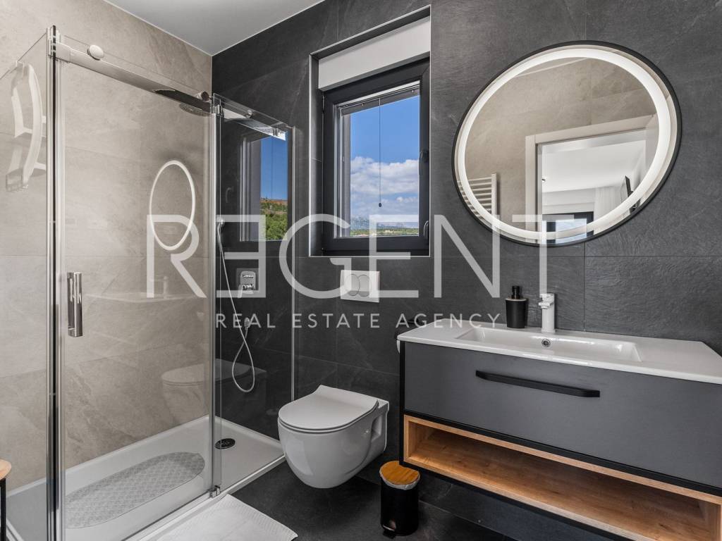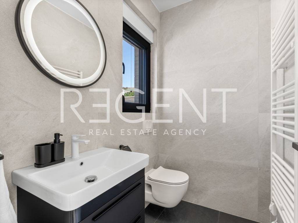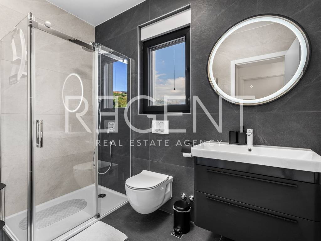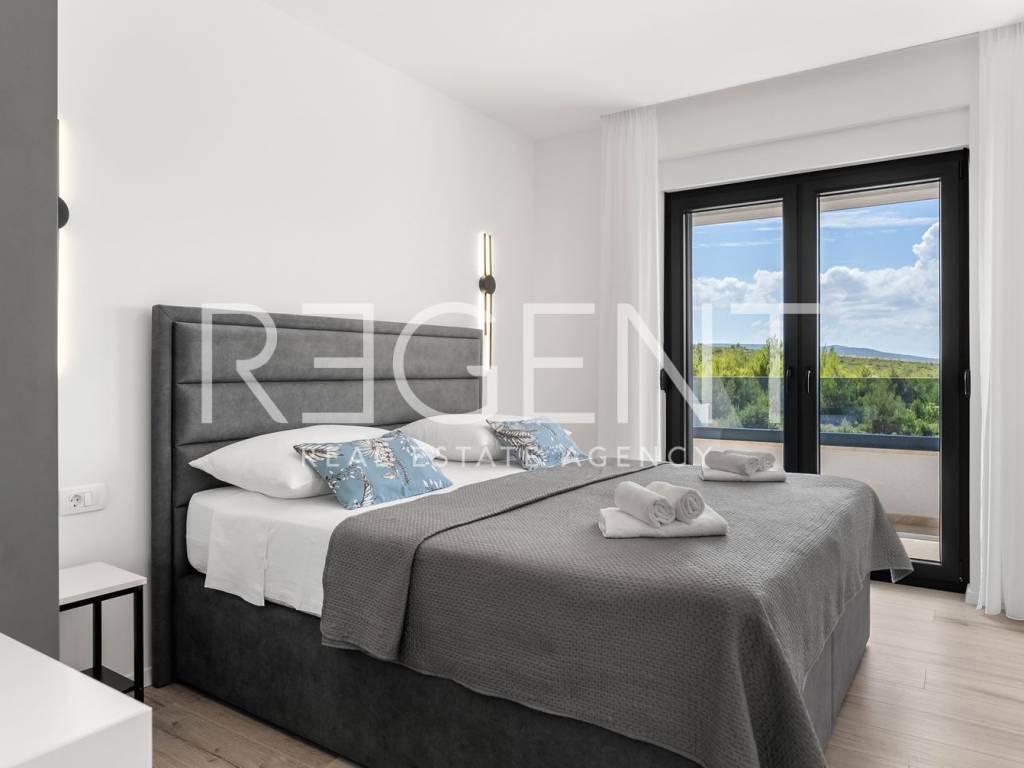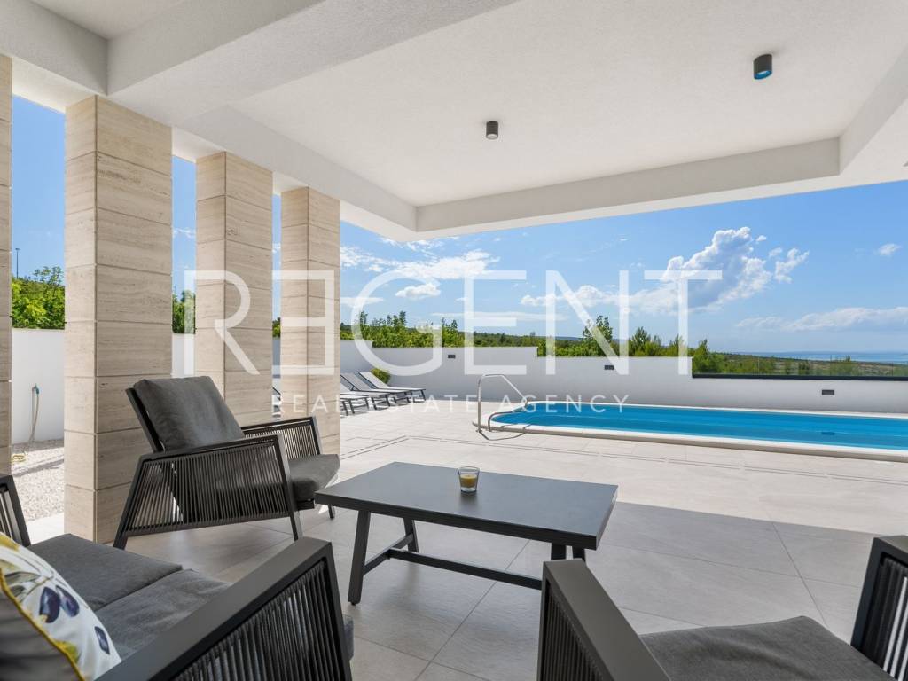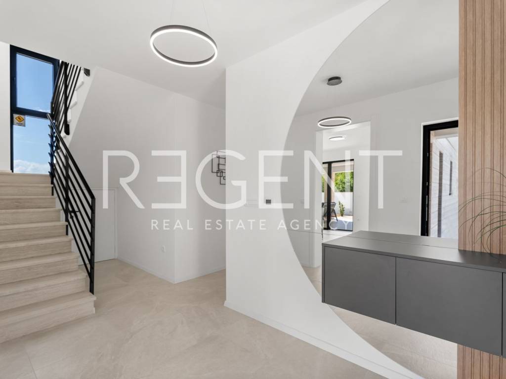 Moderne, neu gebaute Villa in einem ruhigen Teil von Rovanjska bei Zadar, nur 300 Meter vom Meer und Strand entfernt. Besteht aus: ERDGESCHOSS: Eingangshalle, Aufenthaltsraum mit Ausgang zur überdachten Terrasse, separates WC, Vorraum, zwei Schlafzimmer mit Balkonzugang, zwei Badezimmer, Waschküche, Abstellraum und Innentreppe. ERSTER STOCK: Innentreppe, Vorraum, Küche, Esszimmer und Wohnzimmer in offenem Konzept mit Balkonzugang und Meerblick, zwei Schlafzimmer und zwei Badezimmer Die Villa wurde hochwertig gebaut, mit einer eingebauten Isolierfassade und ist komplett mit luxuriösen Möbeln ausgestattet. Jeder Raum verfügt über eine professionelle Mitsubishi Klimaanlage, die das Heizen und Kühlen der Räume ermöglicht. Außerdem wurde die Vorbereitung für Fußbodenheizung und die Installation einer elektrischen Wärmepumpe durchgeführt. Die Villa ist hochwertig gebaut mit einer Isolierfassade und ist komplett mit luxuriösen Möbeln ausgestattet. Alle Räume sind mit hochwertigen Mitsubishi Geräten klimatisiert, die zum Heizen und Kühlen dienen. Außerdem wurde die Vorbereitung für Fußbodenheizung und die Installation einer elektrischen Wärmepumpe durchgeführt. Das Grundstück ist komplett angelegt, und im Hof befindet sich ein Außenpool mit einer Fläche von 26 m² mit Sonnenliegen und Dusche. Es gibt auch Außenparkplätze für mehrere Autos. Die Lage der Villa ist hervorragend verkehrsgünstig gelegen, der Anschluss an die Autobahn A1 ist nur wenige Autominuten entfernt, während der Strand und alle wichtigen Einrichtungen nur 300 Meter entfernt sind. Für weitere Informationen und Besichtigungen kontaktieren Sie uns bitte.