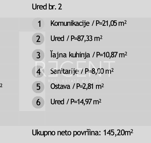 Die Bürofläche befindet sich im 1. Stock eines neuen Geschäftsgebäudes an der Jadranska-Allee, im Herzen der Geschäftszone Lanište. Das Gebäude ist modern gestaltet und mit modernen Installationen ausgestattet, und die Fläche ist ideal für Unternehmen, die ein repräsentatives Büro mit hervorragender Verkehrsanbindung suchen. Die Gesamtnettofläche des Büros beträgt 145,20 m², und besteht aus einem Hauptbürobereich, einer Teeküche, Sanitäranlagen und einem Abstellraum. Der Grundriss ist funktional und ermöglicht die Anpassung an ein Open-Space-Konzept oder separate Arbeitseinheiten. Der Raum ist lichtdurchflutet und hat eine angenehme Arbeitsatmosphäre. Das Gebäude befindet sich an der Jadranska-Allee, mit schnellem Zugang zur Autobahn und zum Stadtzentrum. In unmittelbarer Nähe befinden sich Arena Centar, Kaufland, Sport- und Geschäftseinrichtungen. Die Umgebung ist lebendig, aber ordentlich und ruhig, was den professionellen Eindruck des Raumes zusätzlich verstärkt. Das Objekt verfügt über einen Aufzug, der alle Etagen einschließlich der Garage verbindet, Videoüberwachung und 88 Parkplätze im Gebäude. Das Büro kann zusätzlich an die Bedürfnisse des Mieters angepasst werden, und der Raum eignet sich für IT-, Finanz-, Beratungs- und andere Tätigkeiten. Für weitere Informationen kontaktieren Sie uns bitte.