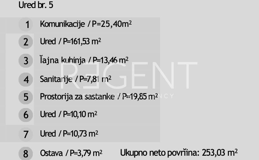 Im 1. Stockwerk eines modernen Bürogebäudes an der Jadranska-Allee befindet sich ein Büro mit einer Gesamtnettofläche von 253,03 m². Der Raum ist geräumig, hell und funktional organisiert, ideal für größere Unternehmen, die eine Kombination aus Arbeits- und Repräsentationsräumen suchen. Das Büro besteht aus einem Arbeitsbereich, einer Teeküche, Sanitäranlagen, einem Abstellraum und einem separaten Besprechungsraum. Der Grundriss ermöglicht Flexibilität bei der Einrichtung – er kann als Open Space genutzt oder in mehrere Büros aufgeteilt werden. Hochwertige Materialien und Ausführung garantieren Komfort und einen professionellen Eindruck. Das Gebäude verfügt über einen Aufzug, eine Garage mit direktem Zugang und 88 Parkplätze. Es liegt an der Jadranska-Allee mit einfachem Zugang zum Zentrum von Zagreb und der Umgehungsstraße. In unmittelbarer Nähe befinden sich das Arena Center, Sportanlagen und Bürogebäude. Dieses Büro ist ideal für Unternehmen, die eine repräsentative Adresse, einen modernen Raum und einen einfachen Zugang kombinieren möchten. Das Objekt ist ein Neubau, und die Einrichtung kann an die Bedürfnisse des Mieters angepasst werden. Für weitere Informationen kontaktieren Sie uns bitte.