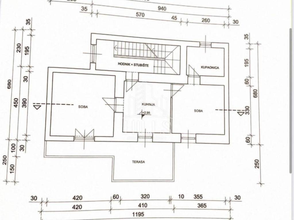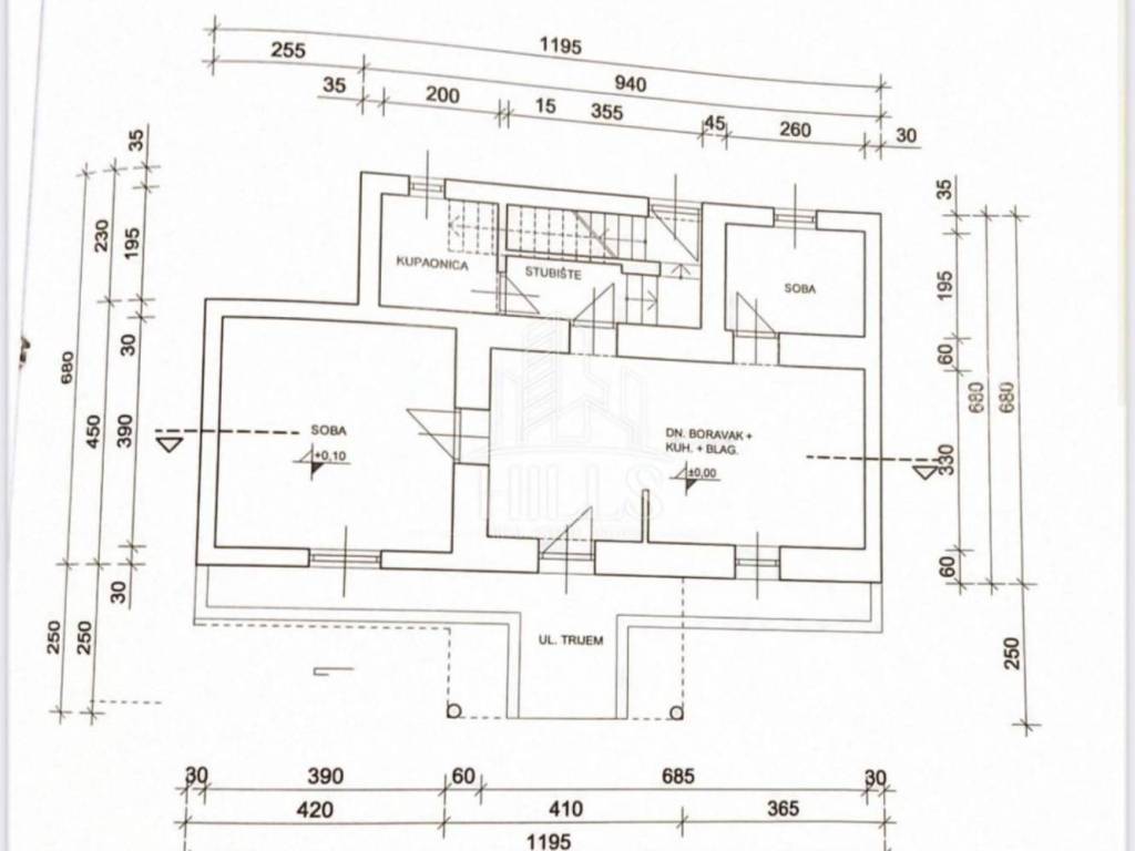 Prvi kat: stan površine79 m2 koji se sastoji od dvije svapaće sobe, kuhinje, blagovaonice, kupaonice s wc-om, ulaznog prostora i terase.