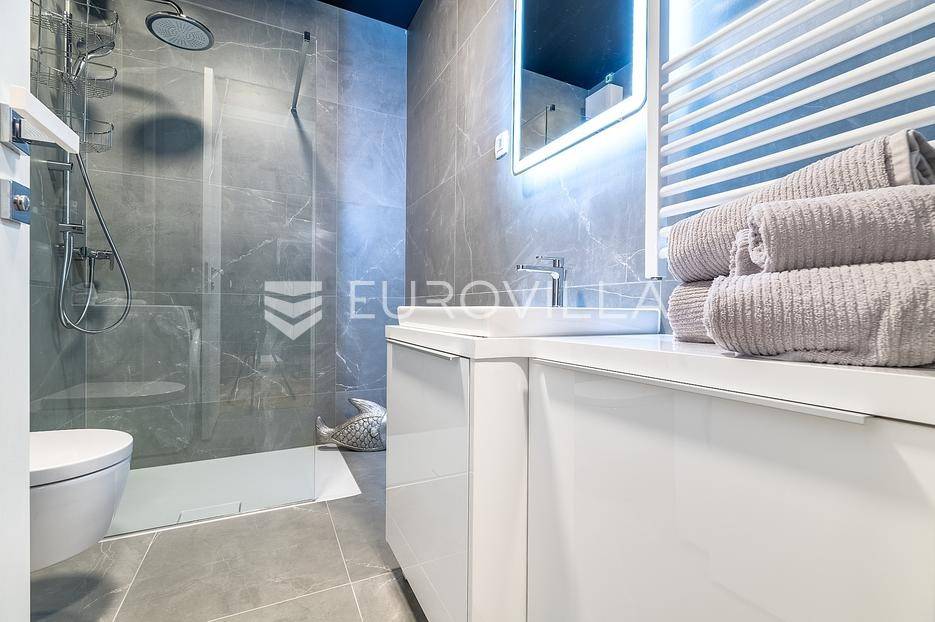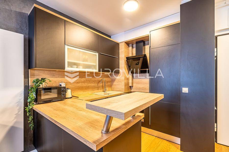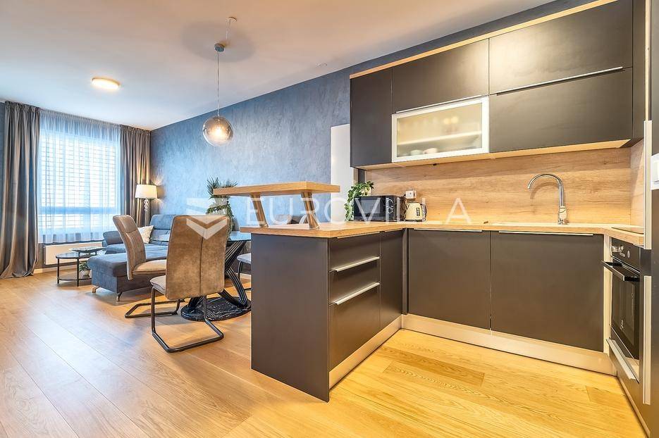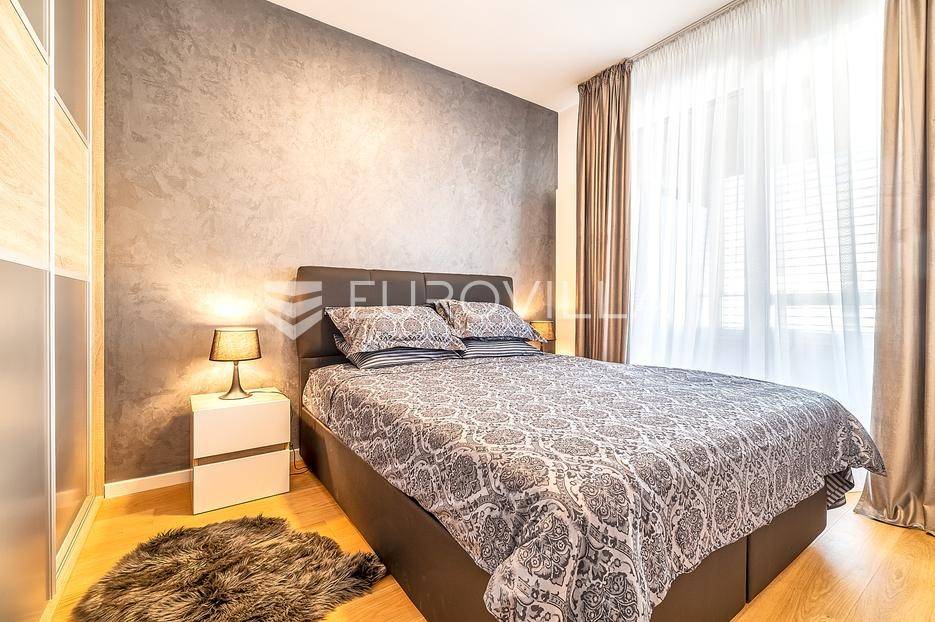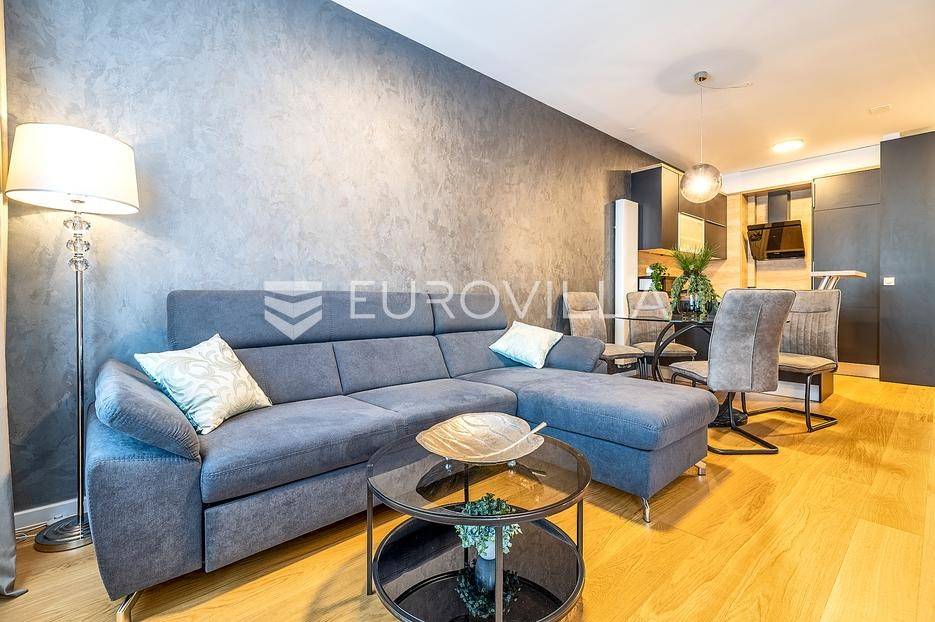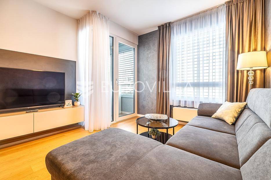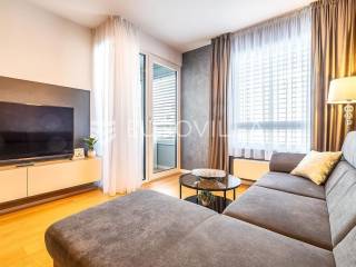 Trnjanska cesta, luksuzan dvosoban stan s loggiom i garažnim parkirnim mjestom, sveukupne površine 58,3 m2 na 5. katu izuzetno kvalitetne novogradnje (2021. godina) - atraktivnog stambeno poslovnog kompleksa Saras centar.Sastoji se od ulaznog prostora, kuhinje s blagovaonskim dijelom i dnevnim boravkom otvorenog koncepta i s izlazom na loggiu, kupaonice s tzv. walk-in tušem i spavaće sobe s izlazom na loggiu. Površina stana iznosi 45,3 m2. U cijenu stana uključeno je i garažno parkirno mjesto površine 13 m2 (zasebno etažirano pa je moguća kupnja samog stana). Ukupno prodajno NKP 51,8 m2.Opremljen je prvoklasnim materijalima i namještajem. Podne obloge su kombinacija hrastovog parketa i velikoformatnih keramičkih pločica, ALU stolarija s troslojnim staklima, električne žaluzine itd. Grijanje je etažno plinsko upravljivo preko aplikacije (SMART), klima, LED rasvjeta, optički internet, video portafon i video nadzor zgrade.Stan se prodaje potpuno namješten.Nalazi se u mirnoj ulici šireg centra, a izvrsno prometno povezano. Na 15 min. vožnje do aerodroma Franje Tuđman i 15 min hoda do glavnog zagrebačkog trga bana Jelačića. U neposrednoj blizini javnog prijevoza (mnoge tramvajske i autobusne linije), Nacionalne i sveučilišne knjižnice, poznatih fontana, koncertne dvorane Vatroslav Lisinski itd., te svih potrebnih sadržaja za život.Sve ostale informacije na upit.