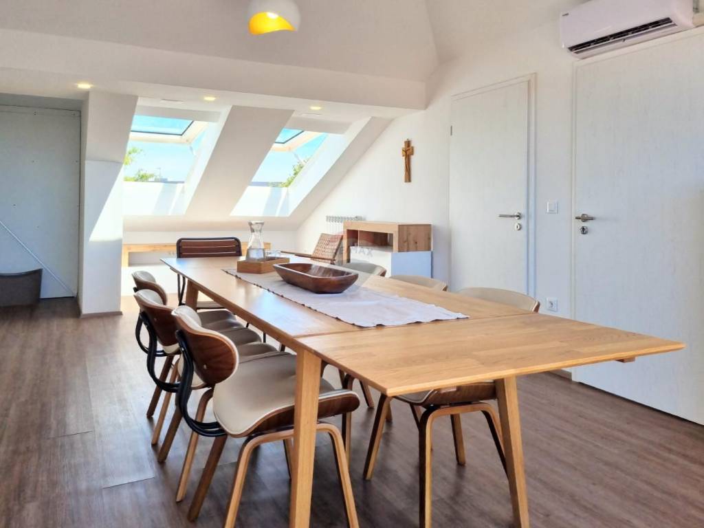 3. Etage – großes Esszimmer mit Zugang zur Terrasse, 2 Schlafzimmer und ein großes Badezimmer mit Dusche und Badewanne.