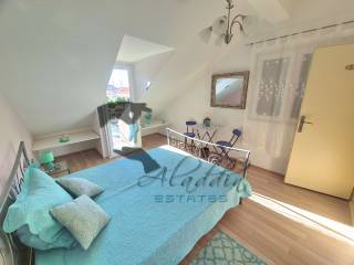 Im Erdgeschoss befinden sich die Küche mit Essbereich und Wohnzimmer, ein Badezimmer, ein Abstellraum und ein Flur mit Treppe. Auf der Außenseite erstreckt sich größtenteils eine überdachte Terrasse. Die Etage besteht aus zwei großen Schlafzimmern, die durch einen zentralen Flur verbunden sind. Eines der Zimmer wird derzeit als Abstellraum genutzt, in dem auch die Installationen für die Einrichtung eines zusätzlichen Badezimmers nach Wunsch vorgenommen wurden. Auf der Außenseite befindet sich eine charmante Loggia, die zum Entspannen und Erholen einlädt. Das Dachgeschoss enthält ein weiteres äußerst geräumiges Schlafzimmer mit direktem Zugang zu einem unüberdachten Balkon mit wunderschönem Blick auf die Stadt und die Uferpromenade von Trogir. Auf der anderen Seite des Hauses erstreckt sich eine weitere große Terrasse, die ein hohes Maß an Privatsphäre bietet und montiert überdacht ist.