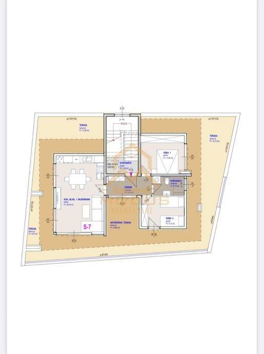 Stan S7 je položen na trećem katu (nadgrađu) objekta, sastoji se od dvije spavaće sobe, hodnika, kupaonice, te dnevnog boravka, kuhinje i blagavaonice u povezanoj cjelini s izlazom na veliku terasu.