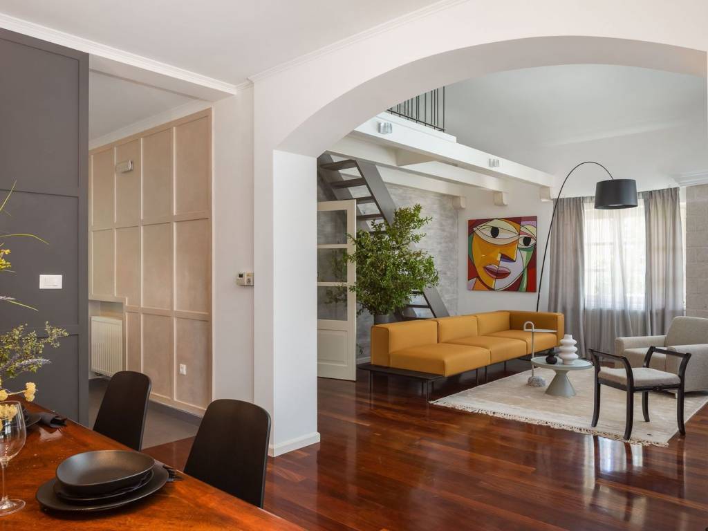 Im 1. Obergeschoss befinden sich 3 Schlafzimmer mit jeweils zugehörigen Badezimmern und Balkonen, ein Arbeits-/Gästezimmer auf der Galerie, ein großes Wohnzimmer mit Essbereich und Küche sowie Zugang zur Terrasse, ein mediterraner Garten mit Pool und eine Sommerküche mit großem Tisch für geselliges Beisammensein unter der Pergola. Auf derselben Etage befinden sich außerdem eine separate Gästetoilette und ein Waschraum.