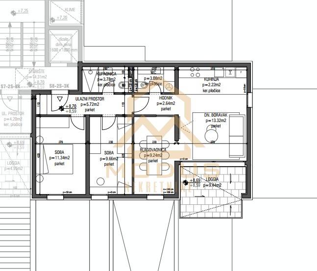 Stan S8 je položen na trećem katu objekta, sastoji se od dvije spavaće sobe, ulaznog prostora, hodnika, kupaonice, wc-a te dnevnog boravka, kuhinje i blagavaonice u povezanoj cjelini s izlazom na loggiu.