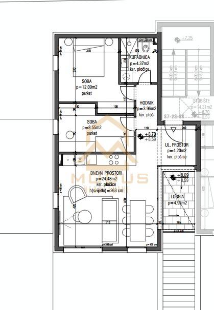Sastoji se od unutarnjeg prostora veličine 57.65 m2 + loggia 4.95 m2 = Ukupno 62.6 m2 (Obračunski: 61.36 m2)