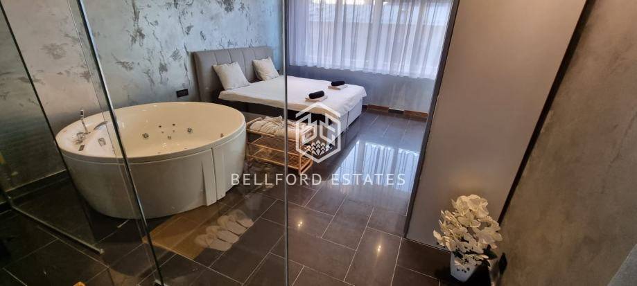 - Spavaća soba i kupaonica odijeljene su prozirnom staklenom stijenom, što prostoru daje ekskluzivan i suvremen izgled.