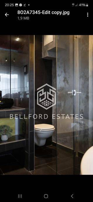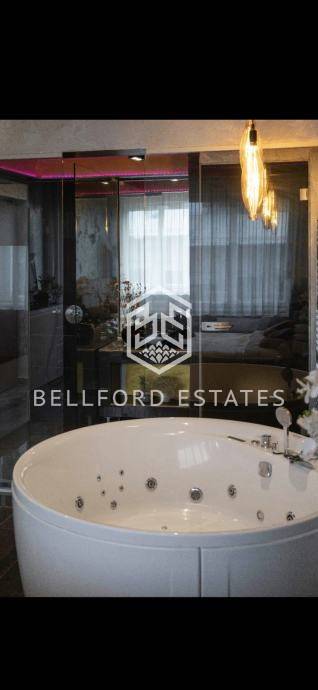 Poseban vizualni dojam stvaraju velika staklena zatamnjena vrata crne boje, kao i dizajnerska rasvjeta. Stan je opremljen i ugrađenim surround sustavom za vrhunski audio doživljaj.