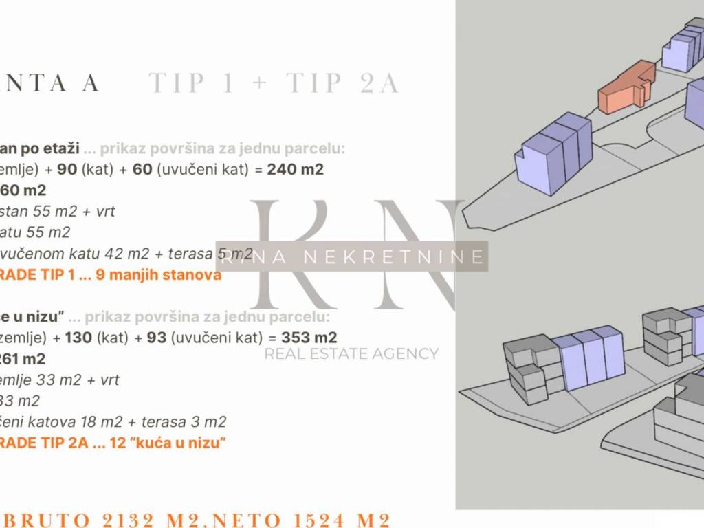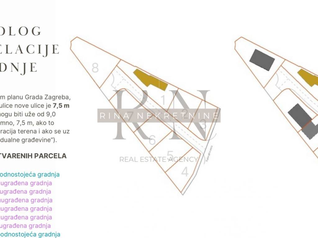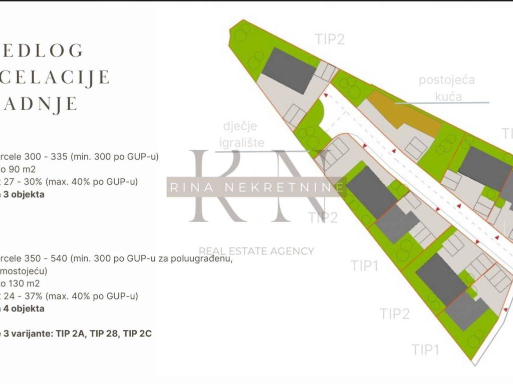 • Oblik i pristup: idealno za planski raspored zgrada, s direktnim pristupom javnoj prometnici, prijedlog je parcelizacija 8 parcela kako radi maksimalne iskoristivosti