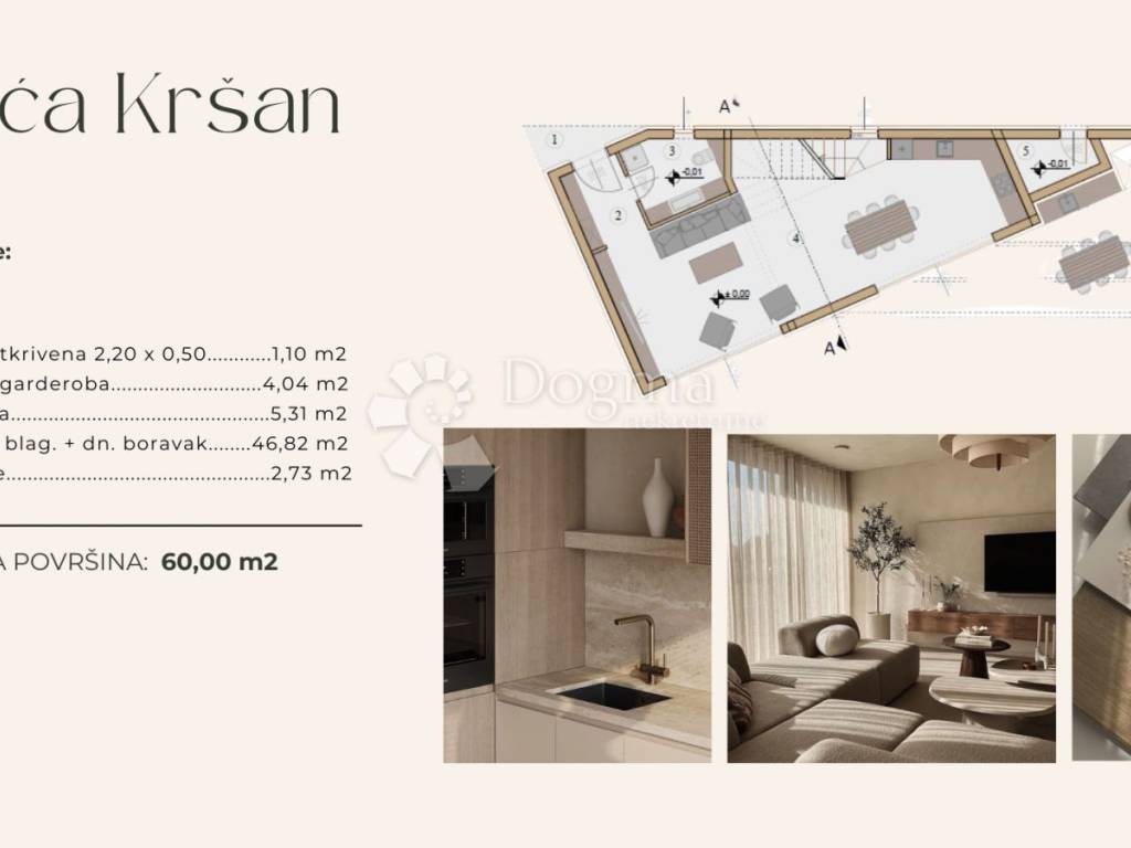 Mjesto Kršan nalazi se blizu grada Labina i jednog od najpopularnijih turističkih odredišta - Rabac, te nudi sve što je potrebno za pravi odmor, zbog čega je potražnja za ulaganjem u nekretnine na tom području sve veća. Osim spomenutih gradova, jednako brzo dolazi se i do mjesta Brestova iz kojeg vas trajekt prevozi na otoke Cres i Lošinj.