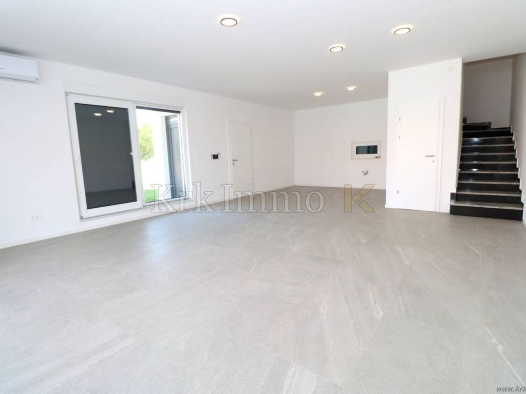 For sale is a new semi-detached house, located in Malinska, only 600 meters from the coast of the Adriatic Sea. This elegant villa extends to 156 m2, includes ground floor and first floor, and is located in a quiet environment that provides privacy.