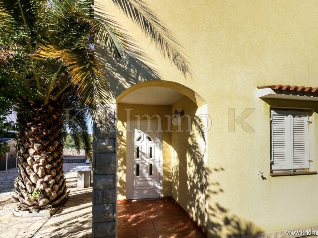 The ground floor features an entrance hall, toilet, storage room, kitchen, dining area and a living room with access to the terrace. The terrace is ideal for enjoying the mild climate of the island of Krk, and thanks to the green, well-maintained garden filled with Mediterranean plants, trees and palm tree, it provides complete privacy and peace. The first floor consists of two bedrooms, a hallway, a bathroom and a balcony with a beautiful sea view, making this property even more attractive for living or tourist rental.