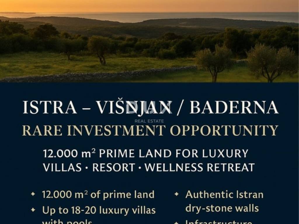 Predstavljamo iznimno građevinsko zemljište površine 12.000 m, smješteno u jednom od najpoželjnijih dijelova središnje Istre području između Višnjana i Baderne, poznatom po prekrasnim panoramama, čistoj prirodi i rastućoj potražnji za luksuznim vilama i turističkim resortima.