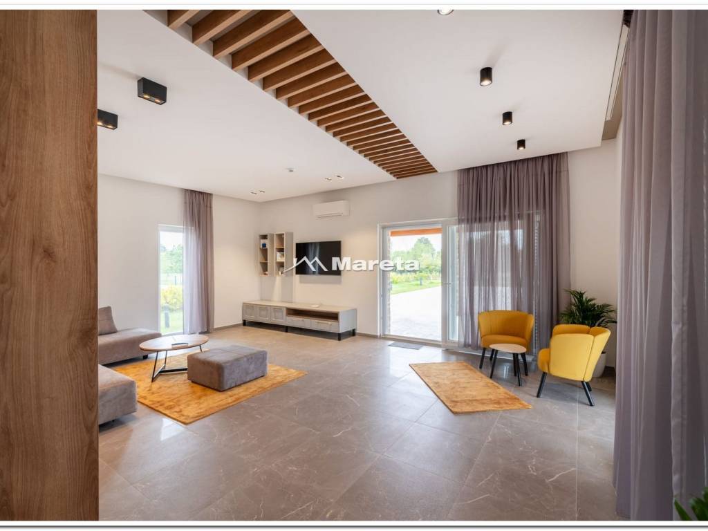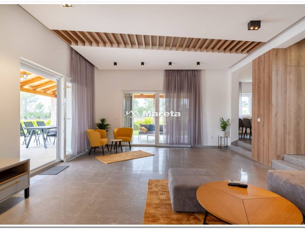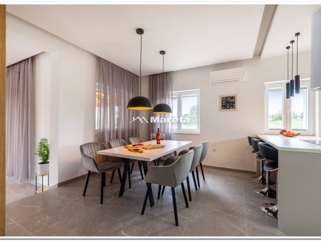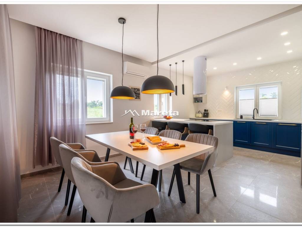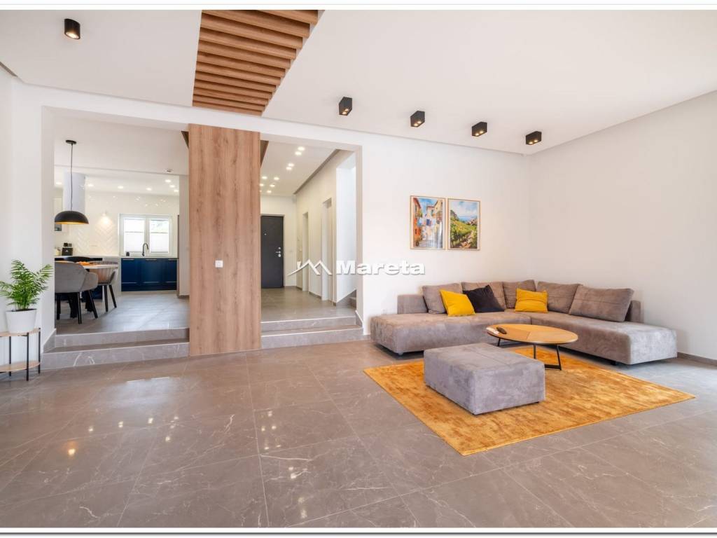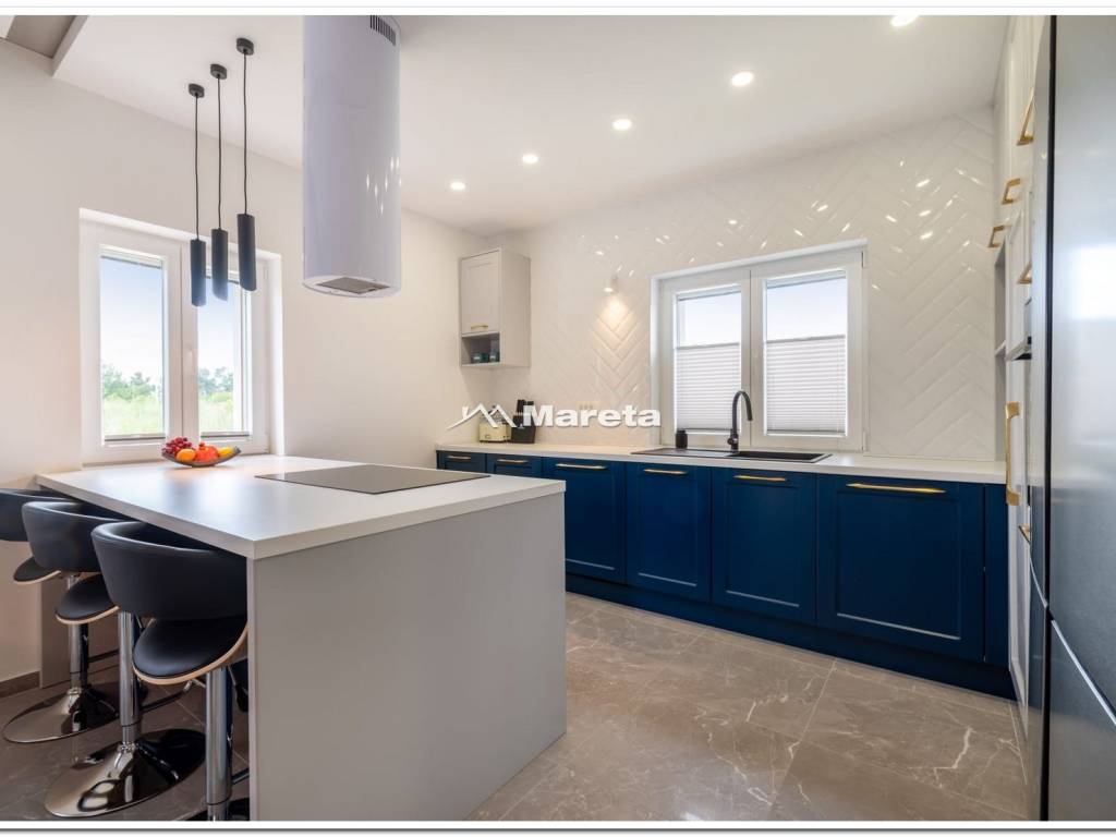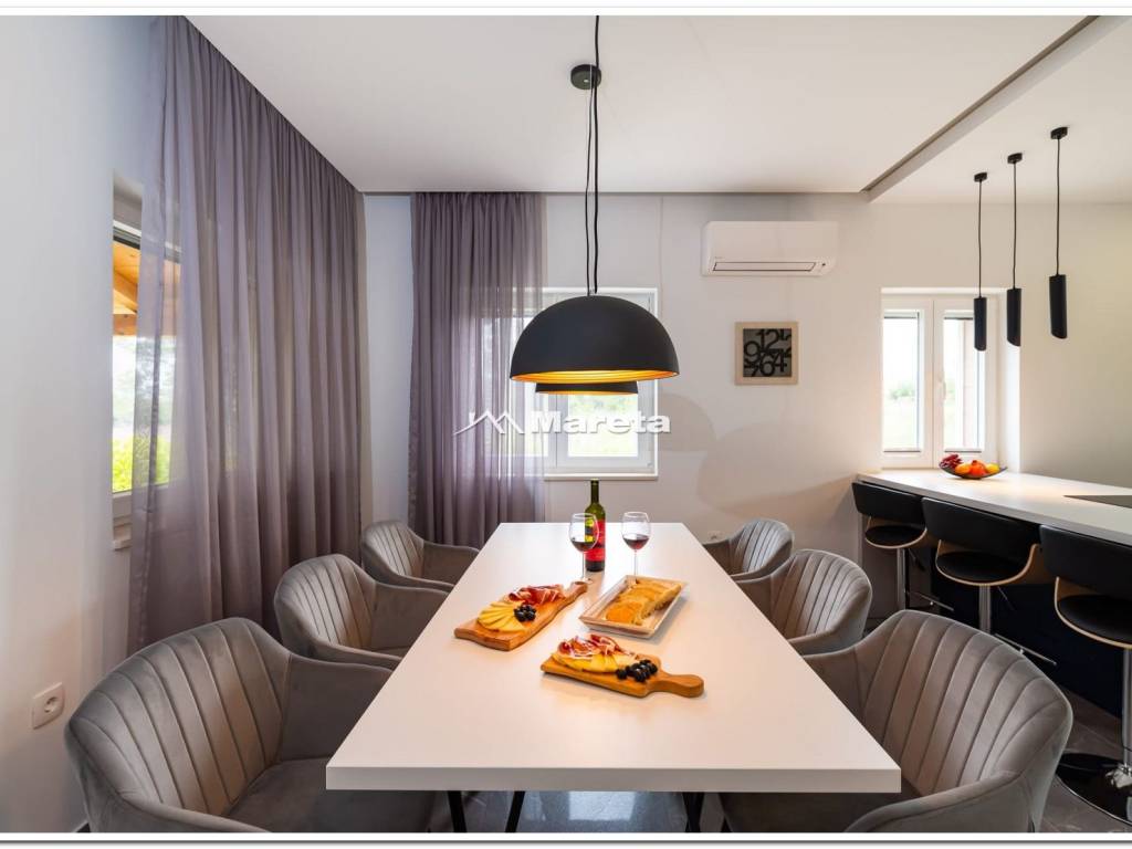 Prizemlje: ulazni hodnik, gostinjski WC, vešeraj i dodatna ostava, moderna kuhinja otvorenog koncepta povezana s blagovaonicom i dnevnim boravkom, izlaz na veliku natkrivenu terasu idealnu za boravak na otvorenom