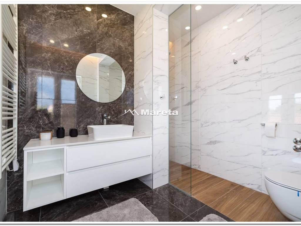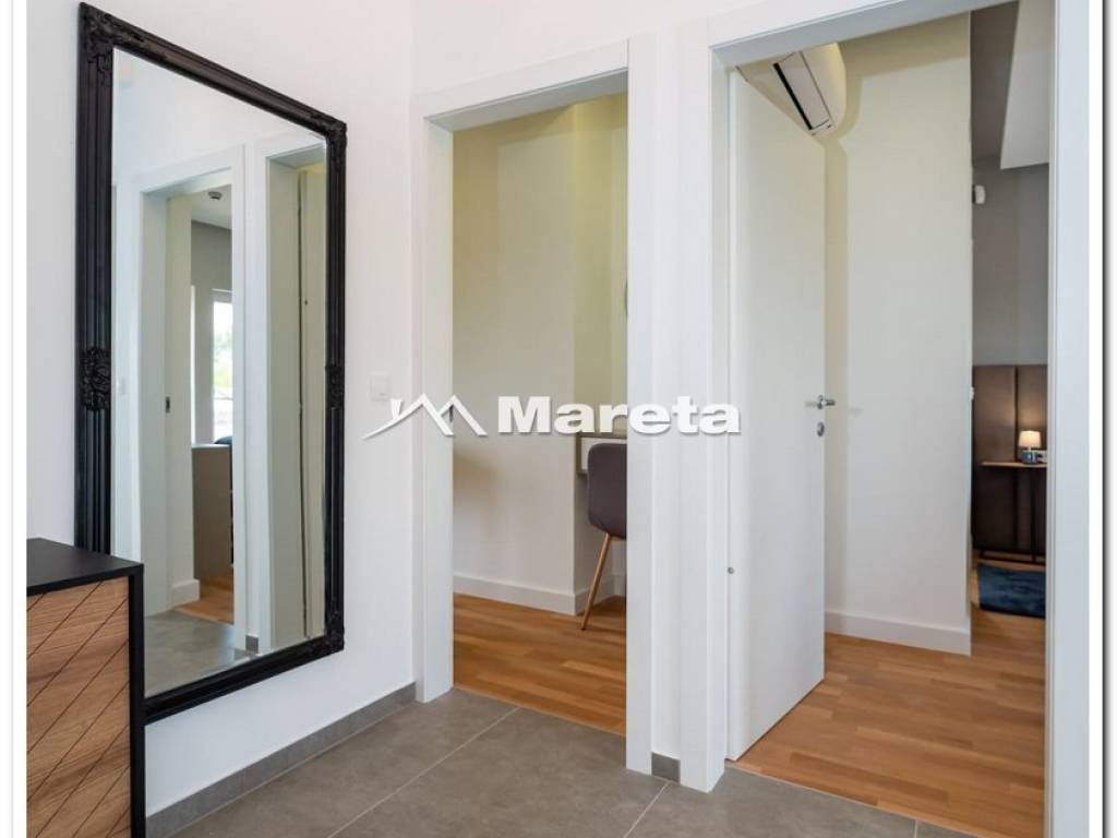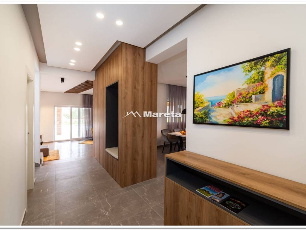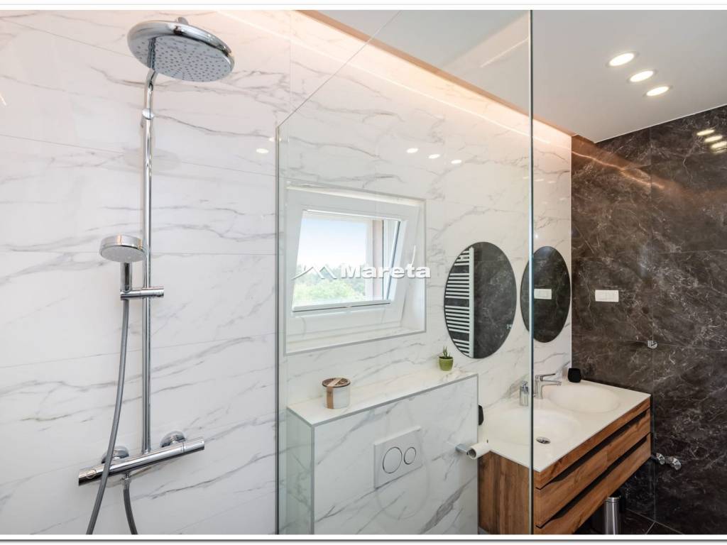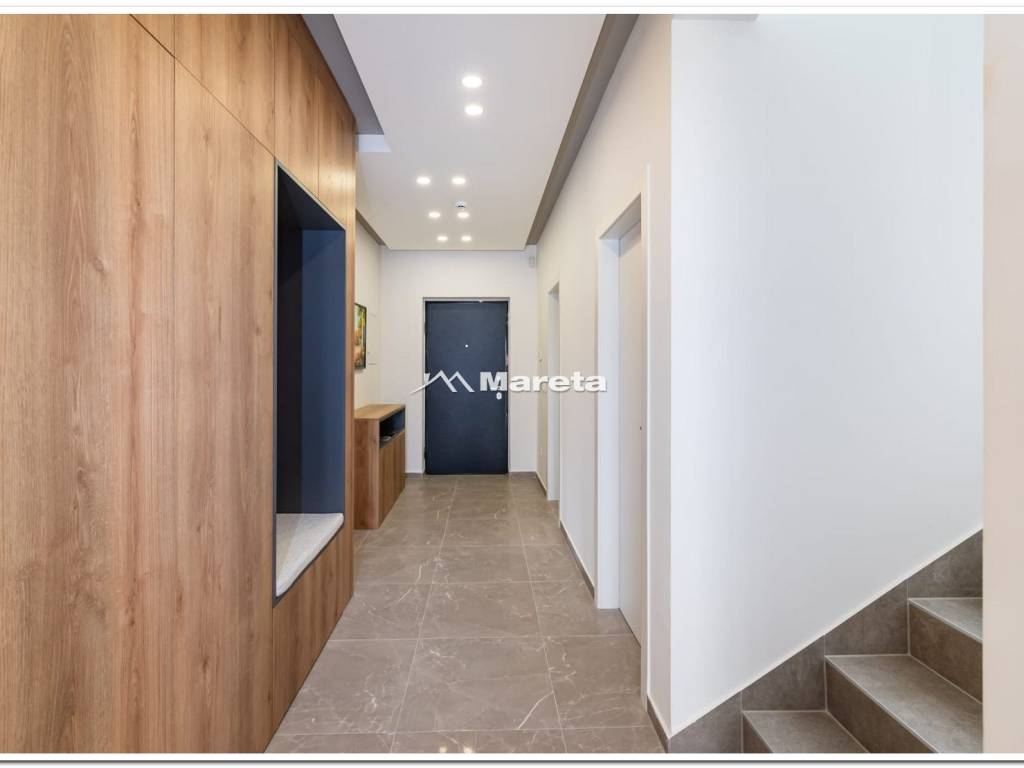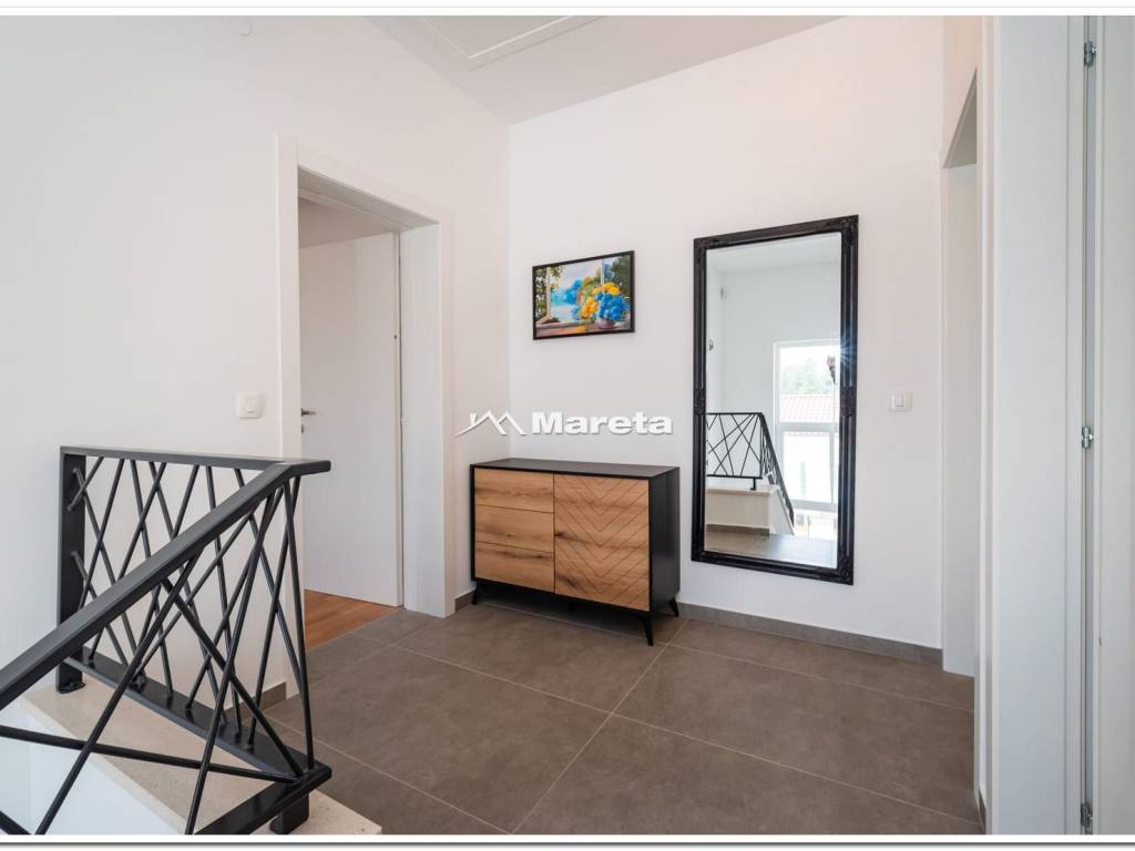 Kat: hodnik, tri prostrane spavaće sobe, tri elegantno uređene kupaonice, garderoba, natkrivena terasa s privatnim kutkom za odmor