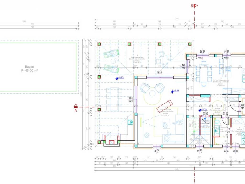 Stambena površina iznosi 223,40 m², raspoređena na dvije etaže: