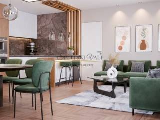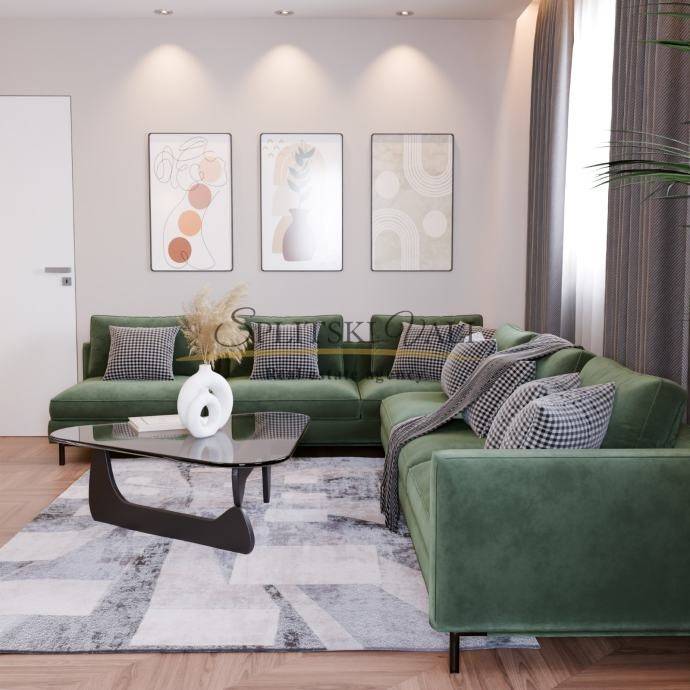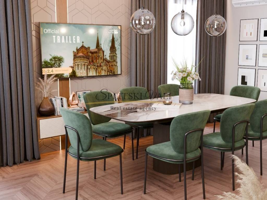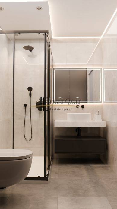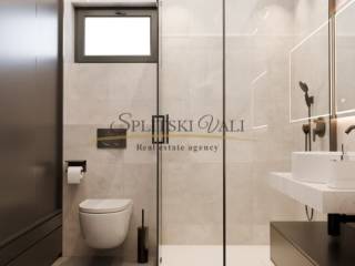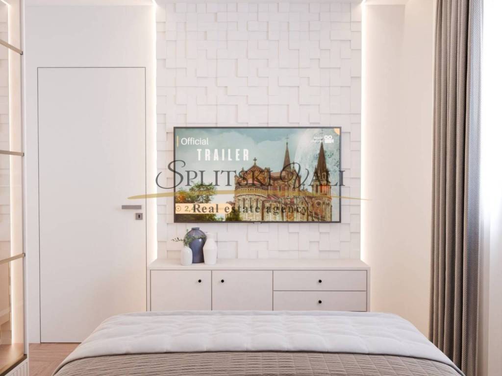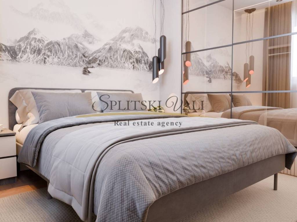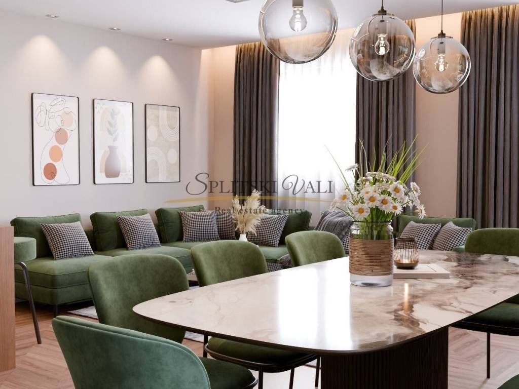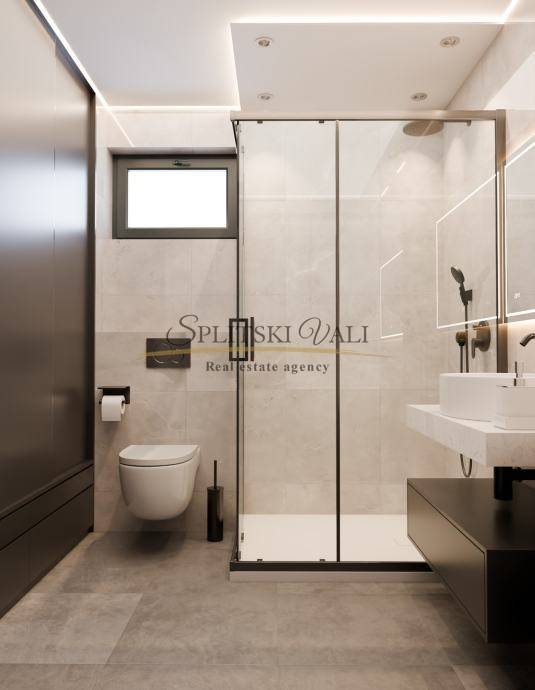 Posredujemo u prodaji stanova u kvalitetnoj novogradnji, pri čemu najprije predstavljamo penthouse, a potom i ostale dostupne stanove. Penthouse ima jugozapadnu orijentaciju te se sastoji od dvije spavaće sobe i prostrane kupaonice, dok glavna spavaća soba posjeduje garderobu i vlastitu kupaonicu (svi sanitarni čvorovi imaju prozor i prirodnu ventilaciju). Spavaći dio odvojen je hodnikom i velikim predulazom od dnevnog boravka koji ima izlaz na terasu. Dnevni prostor i terasa orijentirani su prema Splitu i otocima. U sklopu stana nalazi se i krovna terasa sa zasebnim pristupom i pripremljenim svim potrebnim instalacijama. Kvaliteta gradnje uključuje klasične zidane pregrade, PVC stolariju s troslojnim staklom i roletama na struju, kvalitetnu talijansku keramiku, podno grijanje, Hansgrohe sanitarije, sobna vrata od punog drva te chevron parkete. U ponudi su i jednosobni i dvosobni stanovi smješteni u visokom prizemlju (na garaži, 3 m iznad okoliša) te na prvom katu. Opremljeni su PVC stolarijom (šestokomorna, troslojno staklo) s roletama na struju, talijanskom keramikom, troslojnim parketima te kvalitetnom sanitarnom opremom. Svi stanovi imaju pogled prema moru, a u neposrednoj blizini nalaze se postojeća i planirana nova škola, višenamjensko igralište, vrtići i trgovine. Nudi se mogućnost odabira unutarnjeg parkirnog mjesta sa ili bez ostave, kao i vanjskog parkirnog mjesta. Cijene po m2 razlikuju se ovisno o katu i orijentaciji. U ponudi je više vanjskih i unutarnjih parkirnih mjesta, ovisno o potrebama kupca.
