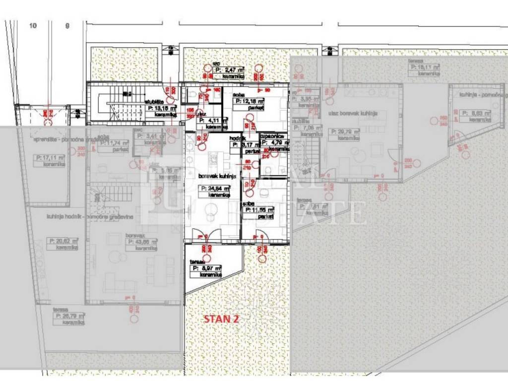 Apartment S2 on the ground floor of the residential building has an internal area of ​​63.11 m2. The apartment consists of a hallway, kitchen with dining area and living room, two bedrooms, bathroom and toilet.