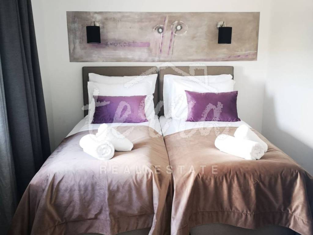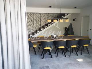 In the spacious ground floor, surrounded by large glass walls that bring light into the entire space, there is a modern kitchen, a large dining room and a living room. All rooms lead to a furnished terrace with a swimming pool that can be enjoyed all year round (the pool has a heat pump for heating). In the extension of the ground floor there is one bedroom with a bathroom and a sauna and a gym with a bathroom.