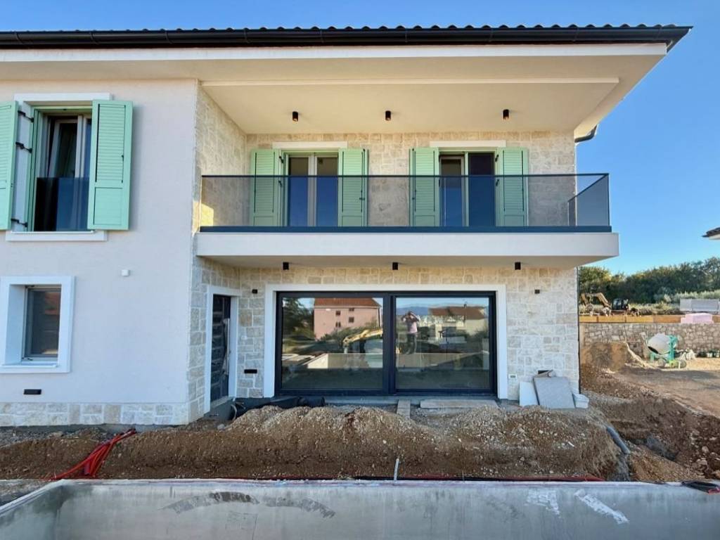 Otok Krk, Malinska, šire područje, prodaja nove dvojne kuće površine 139,69 m2, s bazenom i uređenom okućnicom. Kuća se sastoji od prizemlja s dnevnom sobom, kuhinjom, blagovaonom, toaletom i terasom te prvog kata s tri spavaće sobe, tri kupaonice i balkonom. Kvalitetna gradnja i oprema, klimatizacija, dva parkirna mjesta. Atraktivna lokacija, 700 m od mora.