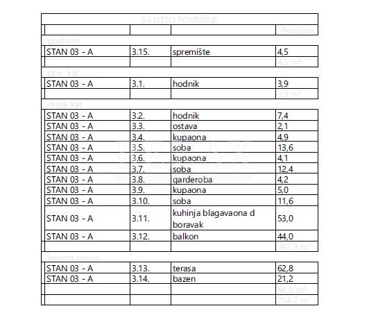 The 166.2 m2 apartment is located on the second floor, it consists of a master bedroom with a walk-in closet and a private bathroom, a hallway, two bedrooms, two bathrooms, a storage room, a large open space kitchen with a dining room and a living room with access to a large a balcony with a beautiful view and from where the stairs lead to the roof terrace of 84 m2 with a swimming pool and sun deck, to which it is possible to add some other content if desired.