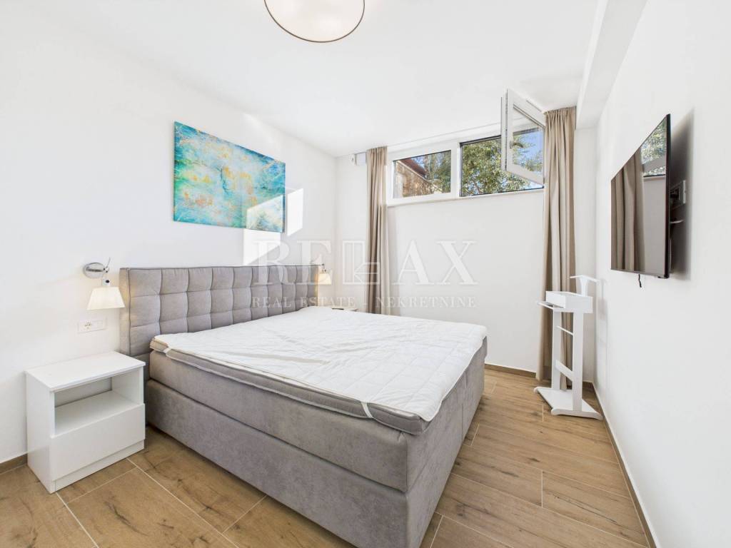 In Njivice, at an attractive location just 500 meters from the sea and 300 meters from the town center, a luxurious two-story apartment with a swimming pool and a landscaped yard is for sale. This property, built in 2022, offers a high level of comfort, quality construction, and top-notch equipment.