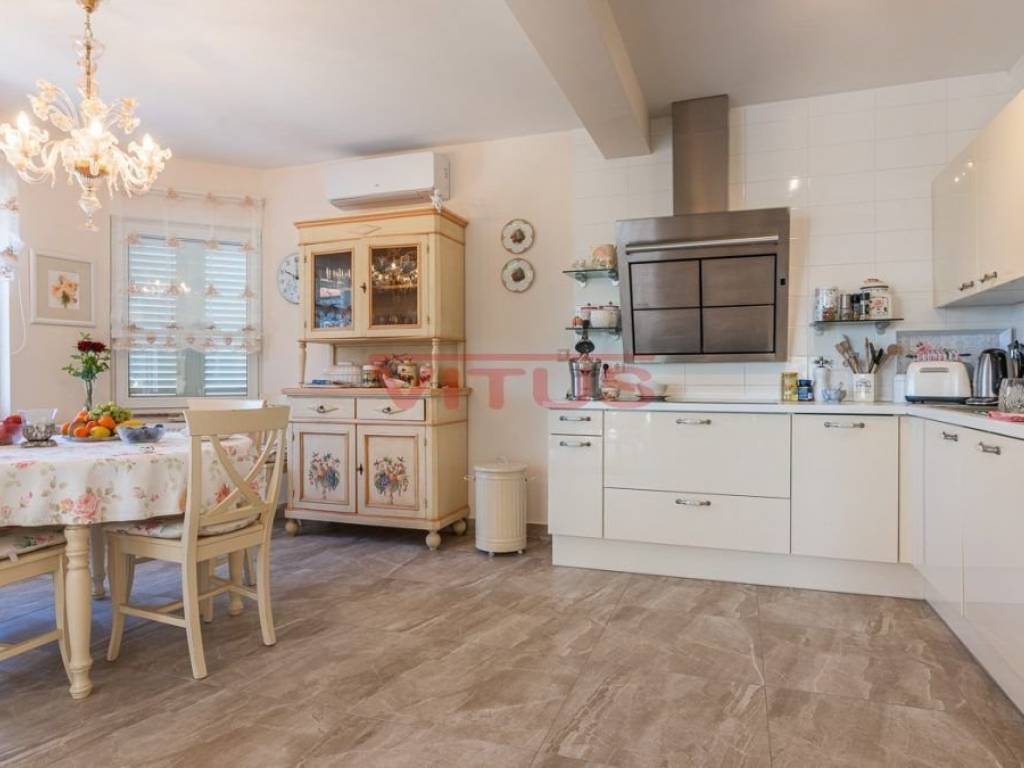 A spacious villa with a total living space of 244 m2 is located in surroundings of Malinska. It consists of ground floor, first and second floor. On the ground floor there is a 57 m2 apartment, a boiler room and a storage room. The apartment has an exit to the terrace. An external staircase leads to the first floor. On the first and second floor there is a luxurious apartment of 152 m2. It consists of an entrance area, living room with kitchen and dining room, two bedrooms and two bathrooms. The living room has access to a covered terrace with a beautiful sea view. There is a barbecue and a space for comfortable parking of several vehicles on the beautifully landscaped garden. Quality construction and equipment, PVC carpentry, air conditioning. Sold furnished. 1500 m from the sea.