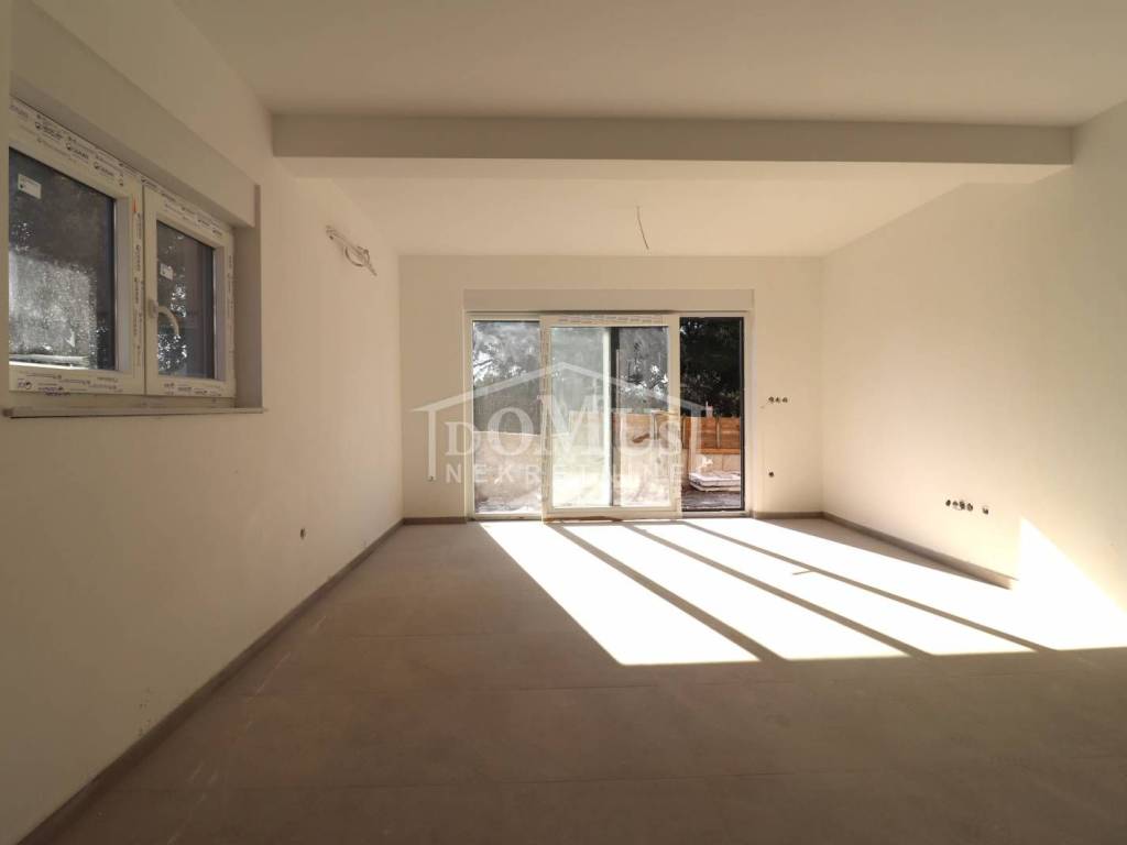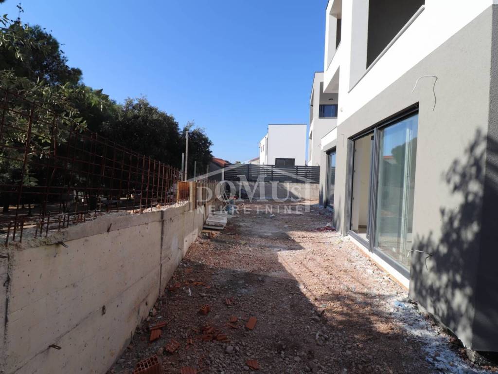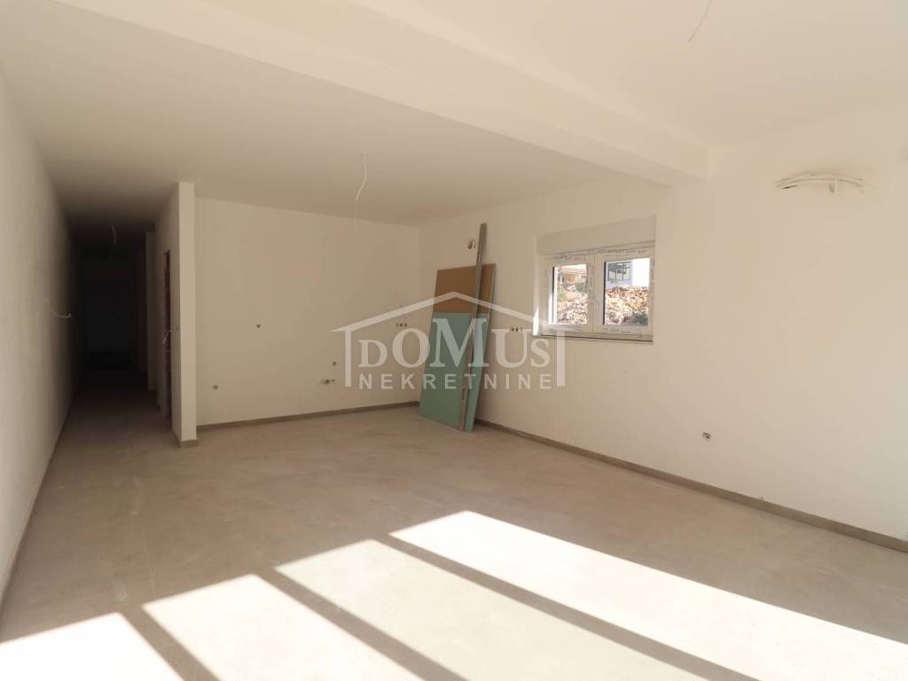 New construction, in an attractive location only 150m from the beach in Žaborić, there is a two-room apartment marked as OB4A-S1 on the ground floor of a residential building with a total of 87.54m2 of usable area. The apartment consists of a hallway, a kitchen with a dining room and a living room with access to a terrace of 25.41 m2, two bedrooms and a bathroom. The apartment will be equipped with high-quality modern ceramic materials, sanitation, PVC carpentry, security doors and air conditioning in the living room, and if the customer wishes, floor heating and electric roller blinds can also be installed at an additional cost. The apartment has one parking space. The move-in is planned for the end of 2024. The distance from the sea and the beach, as well as the center of the town, is only 150m.