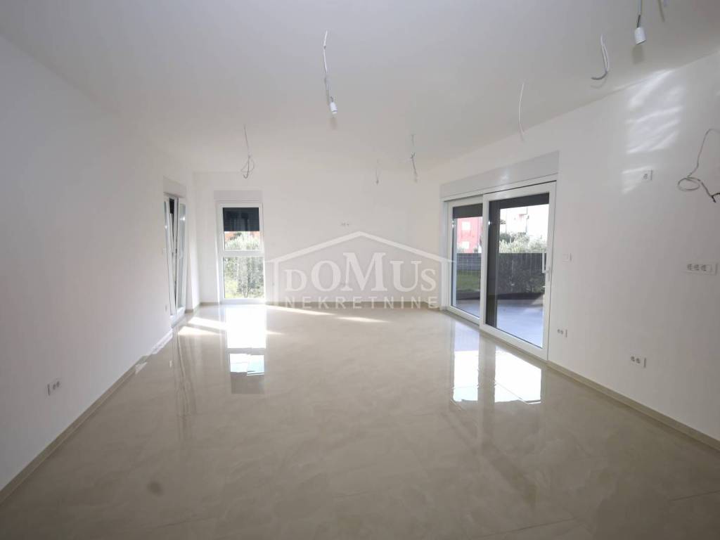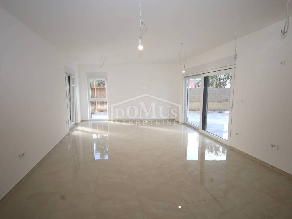 Vodice, new construction, attractive location, spacious two-bedroom apartment on the ground floor. Apartment S1 is located in a small residential building with a total of 3 apartments. It features a modern design and a functional layout, with a total of 112.18 m² of usable space. The apartment consists of a spacious kitchen with dining area and living room in an open layout, a laundry room, two bedrooms – one of which has its own bathroom – a hallway, an uncovered terrace of 31.64 m², and two covered terraces with a total area of 23.59 m². It is equipped with high-quality materials: modern ceramics and sanitary fittings, underfloor heating in the bathrooms, living room and kitchen, electric roller shutters, and air-conditioning units in the living room and all bedrooms. The apartment includes a garden of 128.08 m² and two parking spaces. It is located 600 m from the beach and 800 m from the center of Vodice.