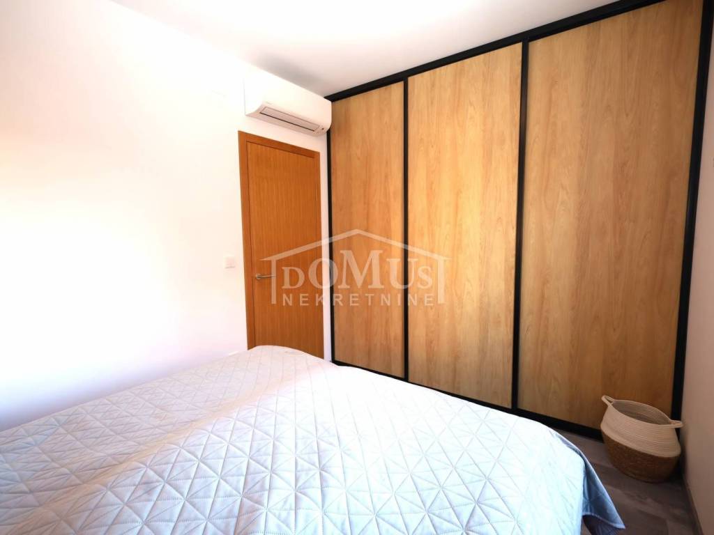 Vodice – In the excellent Blata area, there is a two-bedroom apartment with a large terrace and a beautiful sea view. The apartment is located on the high ground floor of a residential building and has a total usable area of 122.91 m². It consists of a hallway, entrance area, two bedrooms, a bathroom, a separate toilet, and a spacious open-plan kitchen with a dining area and living room, which opens onto a 25.82 m² terrace. From the terrace, stairs lead down to a green lawn garden area of 144 m². The apartment is air-conditioned, modernly furnished, and the furniture is included in the price. It also comes with two parking spaces. The apartment is only 500 m from the beach and 700 m from the centre of Vodice.