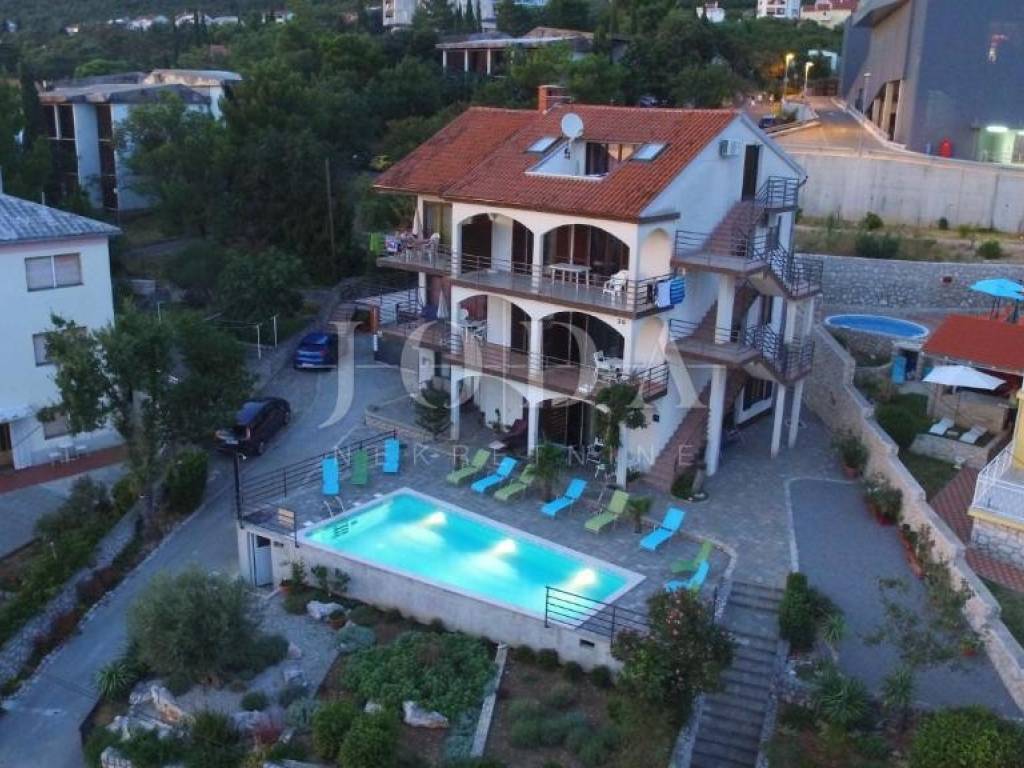 A detached apartment house in one of Crikvenicas most sought-after locations, just 250 m from the sea, represents a rare investment opportunity featuring eight modern, fully equipped apartment units. The property sits on a 759 m plot with a total of 602 m of living space spread across the ground floor, two upper floors, and a high attic, complemented by a landscaped garden and open panoramic sea views.