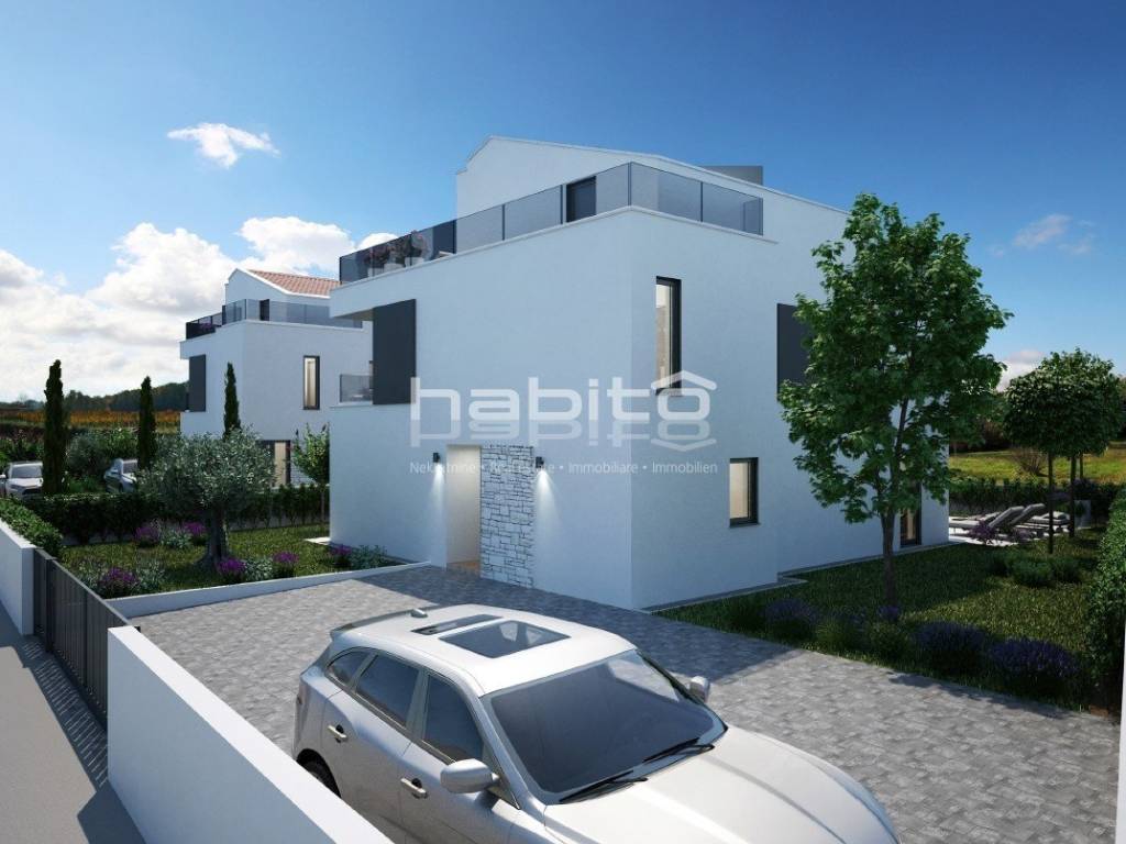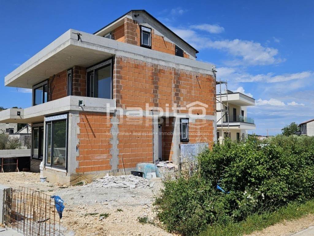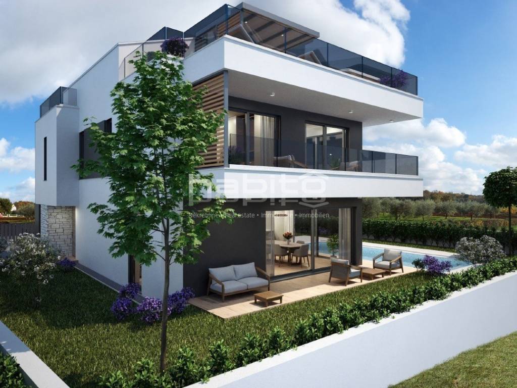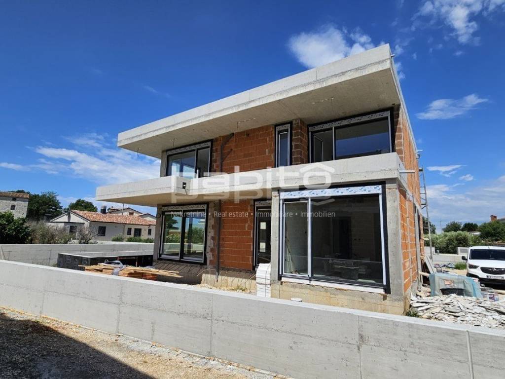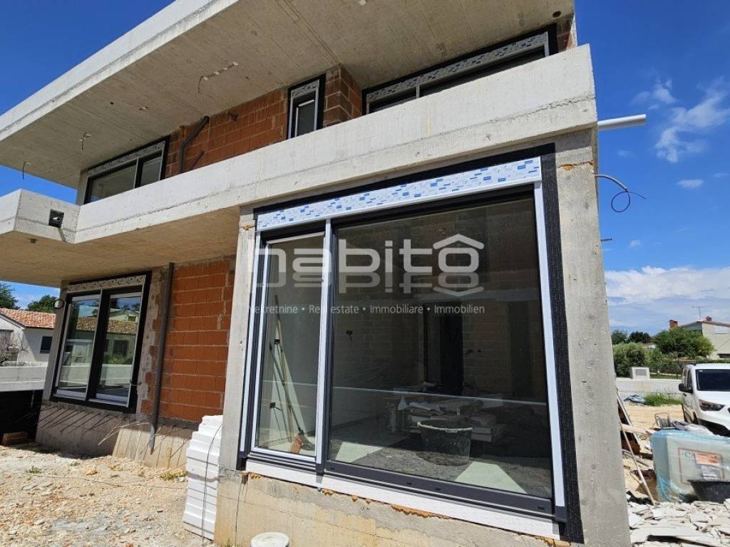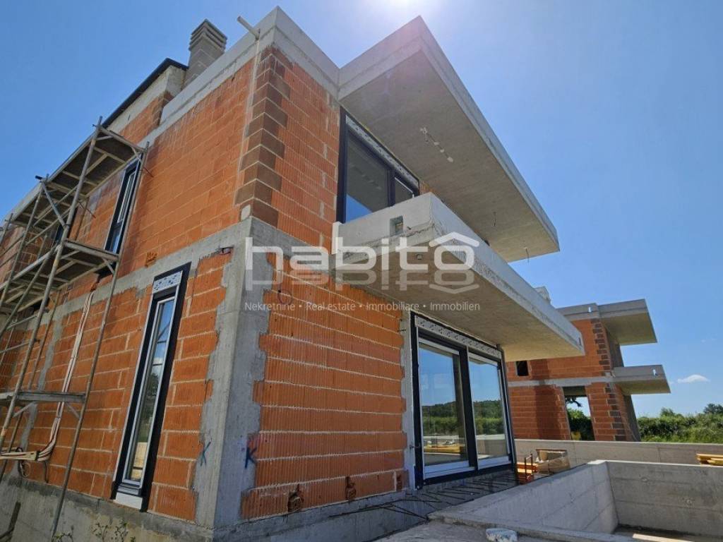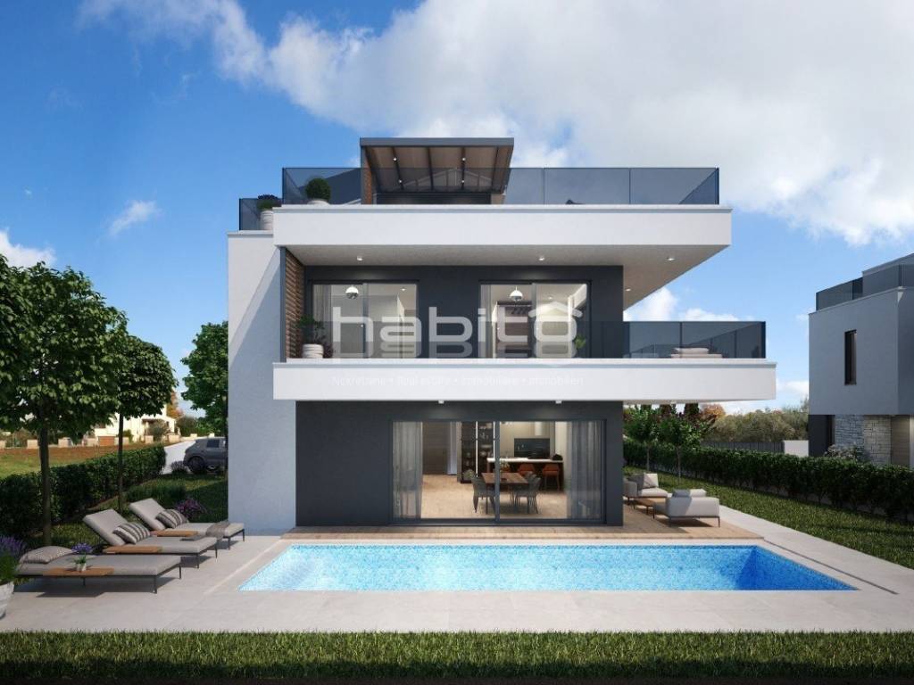 This luxury villa with pool is located in a quiet neighborhood, just 3 km from the sea and the city of Porec. The villa is under construction and has an area of 233 square meters. It consists of a ground floor, first floor, and attic.