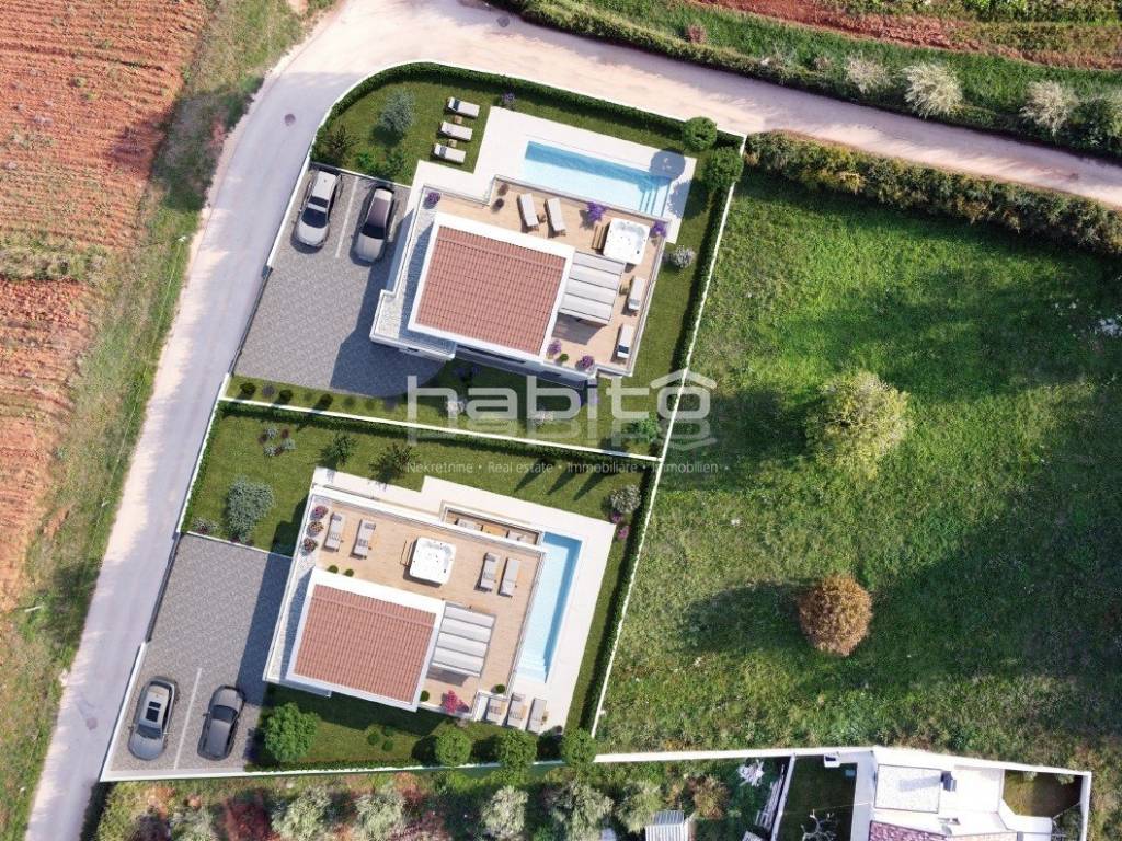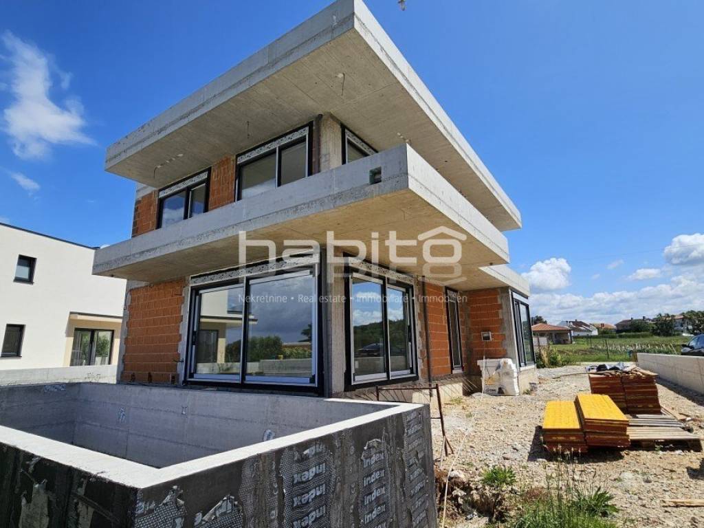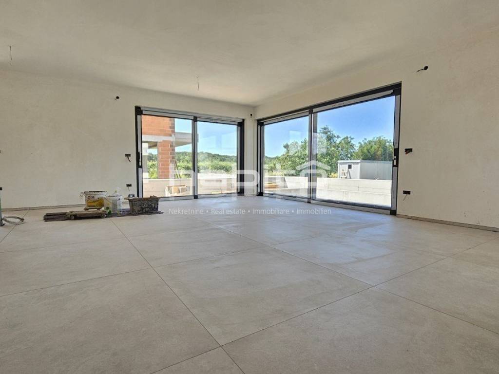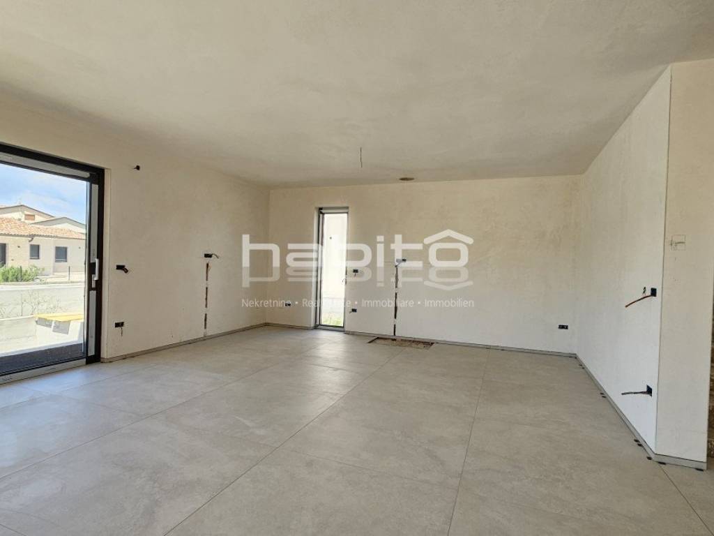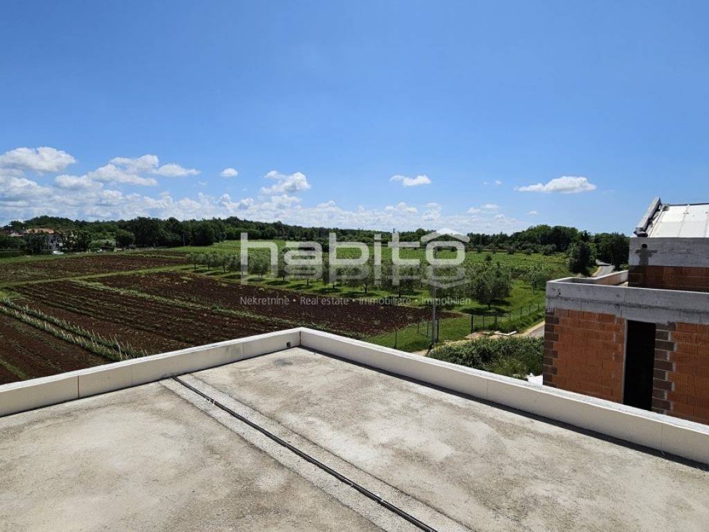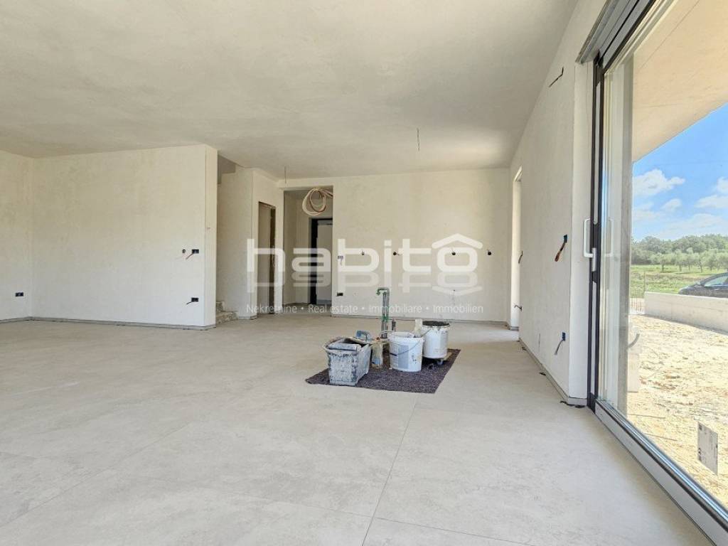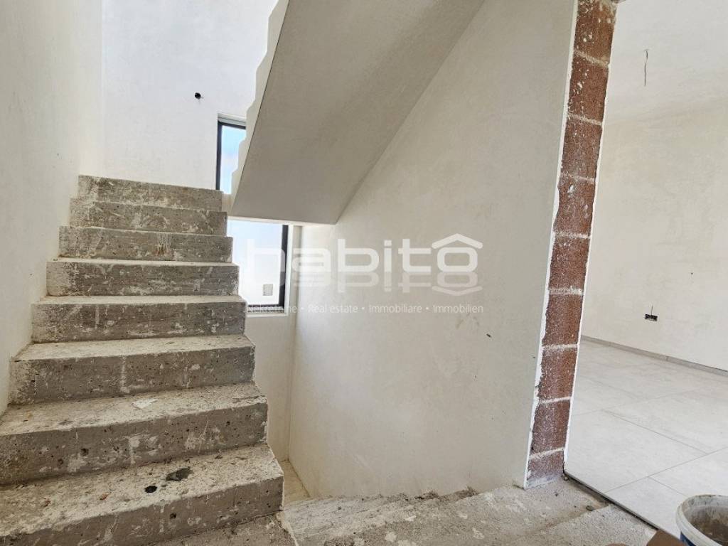 This luxury villa with pool is located in a quiet neighborhood, just 3 km from the sea and the city of Porec. The villa is under construction and has an area of 233 square meters. It consists of a ground floor, first floor, and attic.