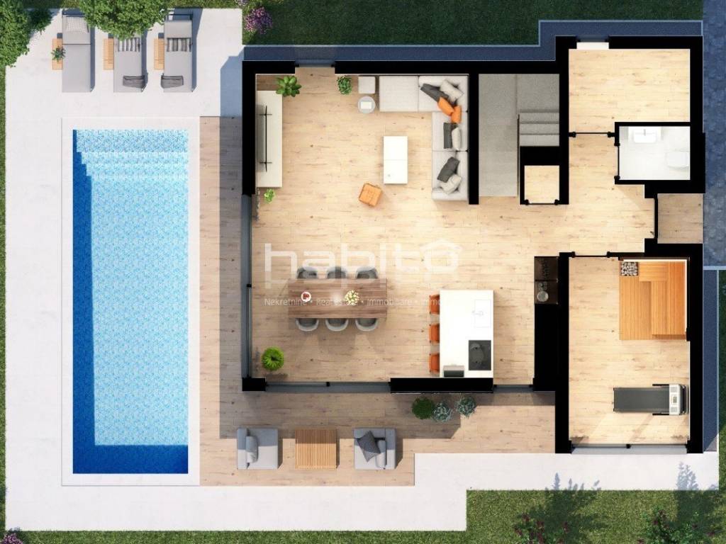 There is a garden with a pool and sunbathing area in front of the villa.