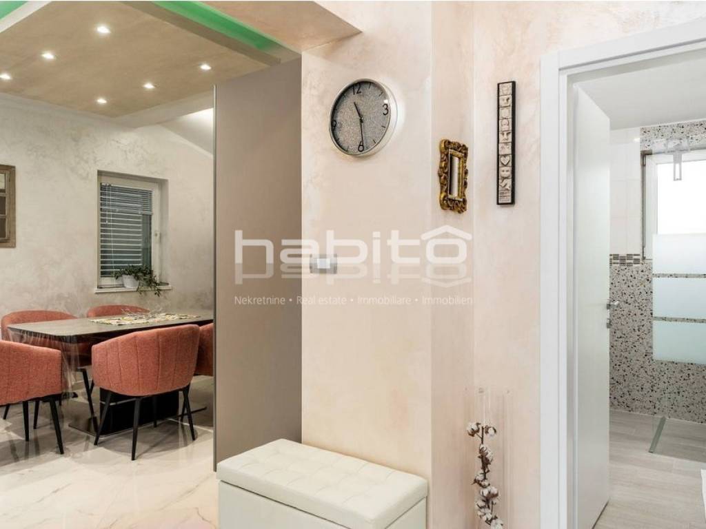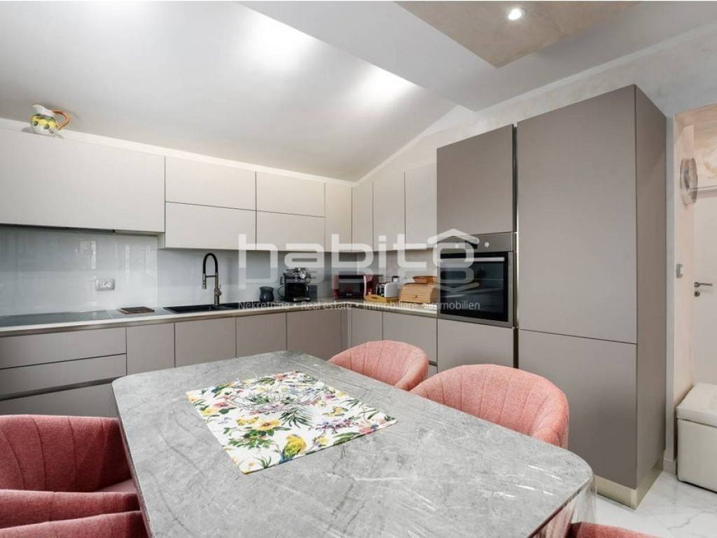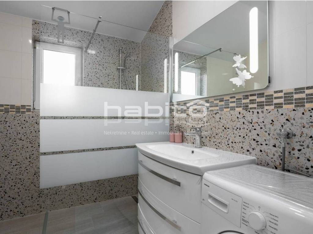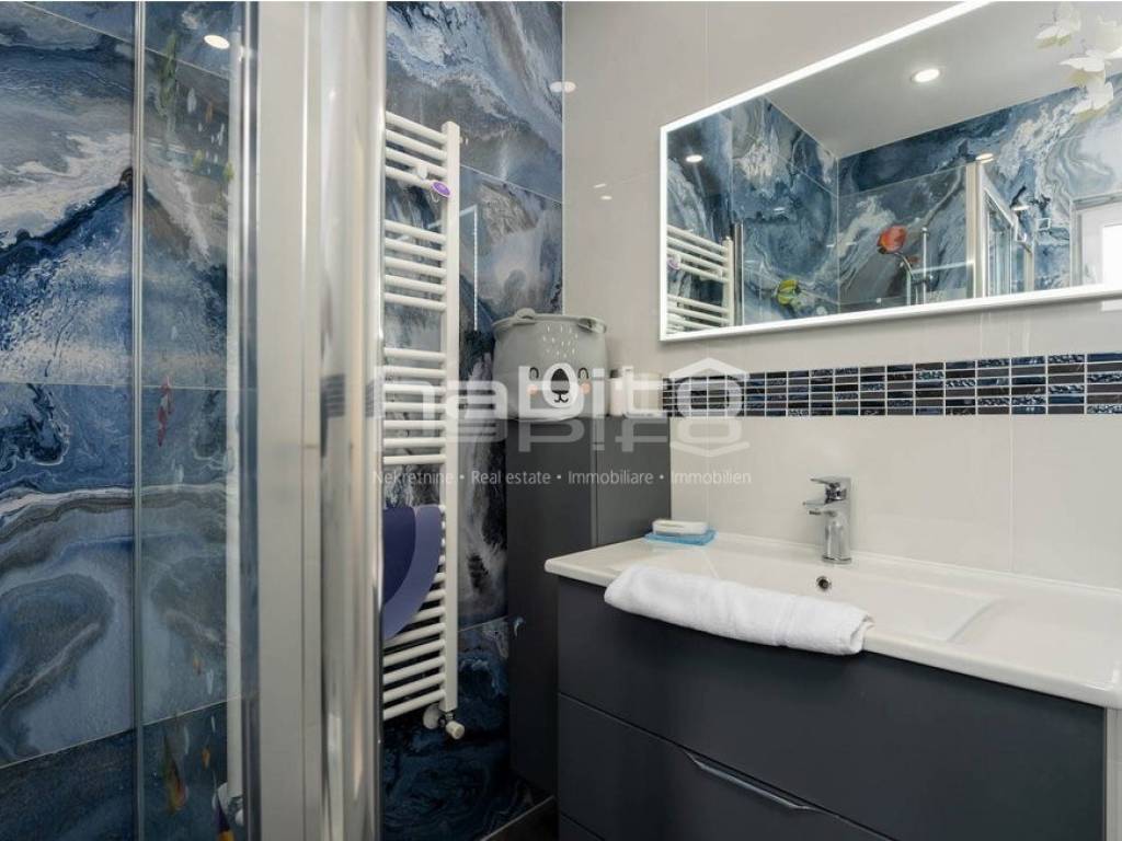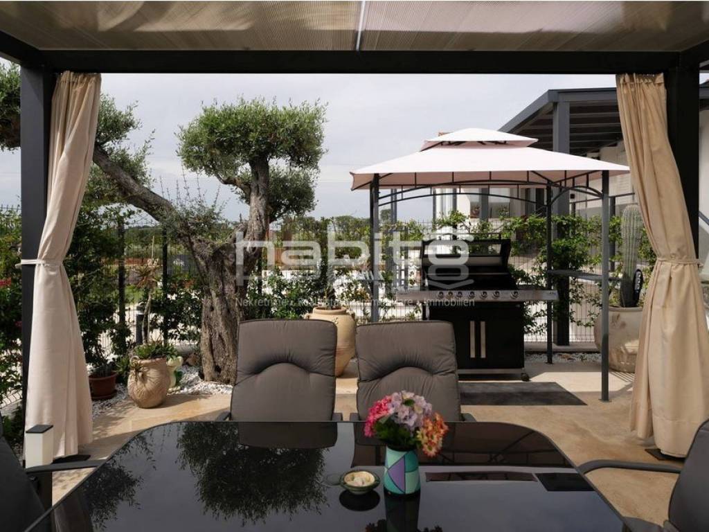 The property also offers an outdoor kitchen with a fireplace and dining room, an outdoor toilet, a jacuzzi with a relaxation area and a view of the old town core of Visnjan, and a swimming pool with a view of the sea.