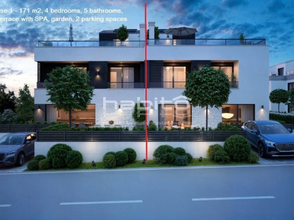 The 168 m2 house consists of a kitchen, dining room, living room, bedroom with bathroom, terrace and guest toilet on the ground floor. On the first floor there are 3 bedrooms with private bathrooms and balconies, while the attic is planned with a SPA area, bathroom, storage room and an uncovered terrace.