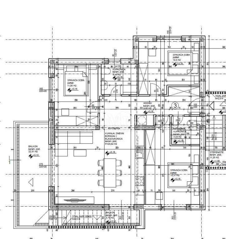 Vodice, new construction – a residential building with 4 residential units. The building has a total of three floors: ground floor, first floor, and a rooftop terrace. It is modernly designed, featuring underfloor heating in the living room and bathrooms, high-quality flooring, air conditioning in every room, PVC joinery, and electric shutters. The residential unit “S2” is located on the first floor and has a usable area of 120.64 m². The apartment consists of an entrance area, hallway, bathroom, three bedrooms (one of which has its own private bathroom), a kitchen, dining room, and living room with access to a terrace of 22.91 m². External stairs lead to the rooftop terrace of 107.88 m², where installations for a jacuzzi are prepared. One parking space is also included.