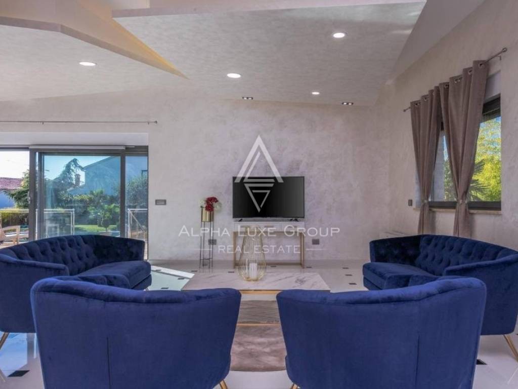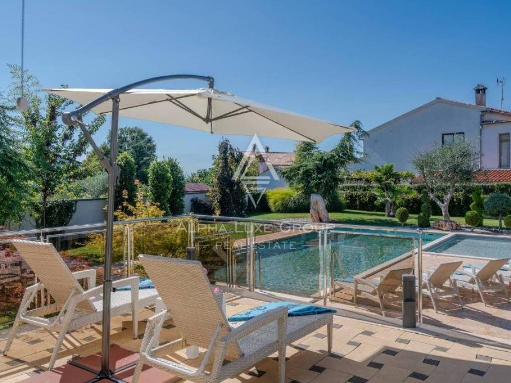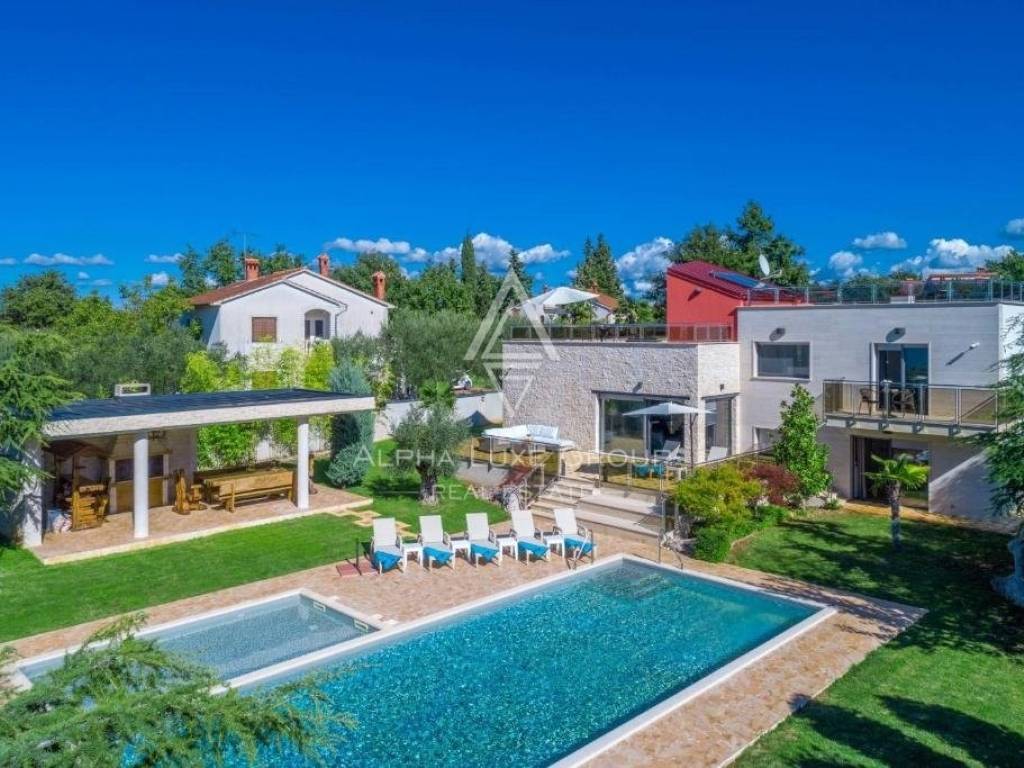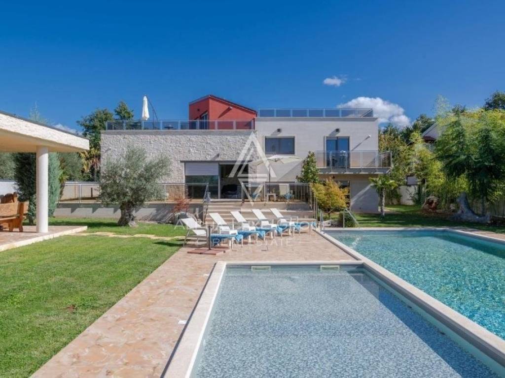 A modern house for sale is located. It is located in a quiet street, surrounded by nature, with a beautiful sea view. Location near Poreč, with an area of 400 m2, on a plot of 1466 m2.