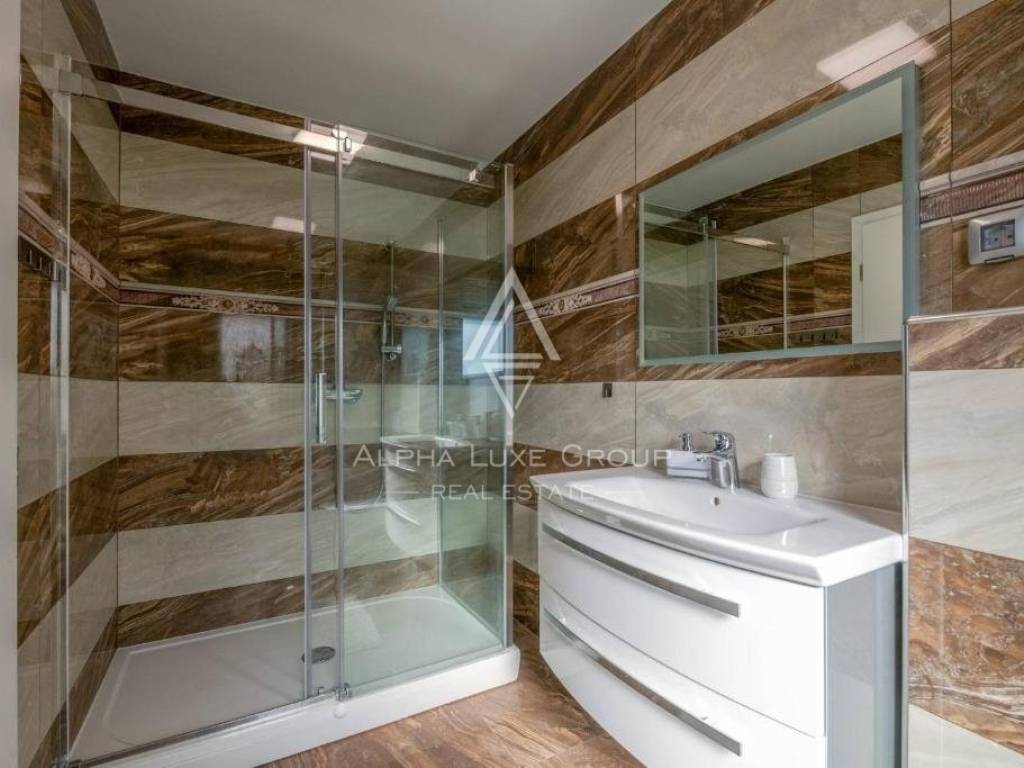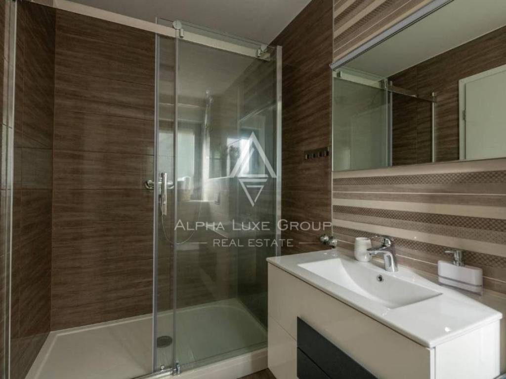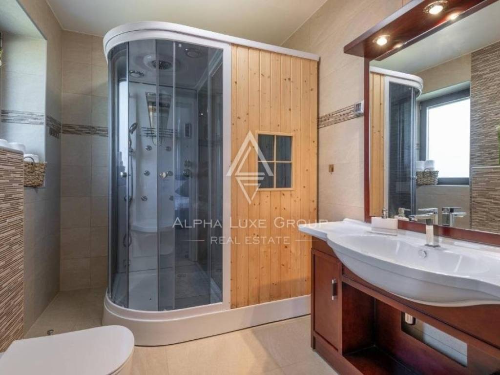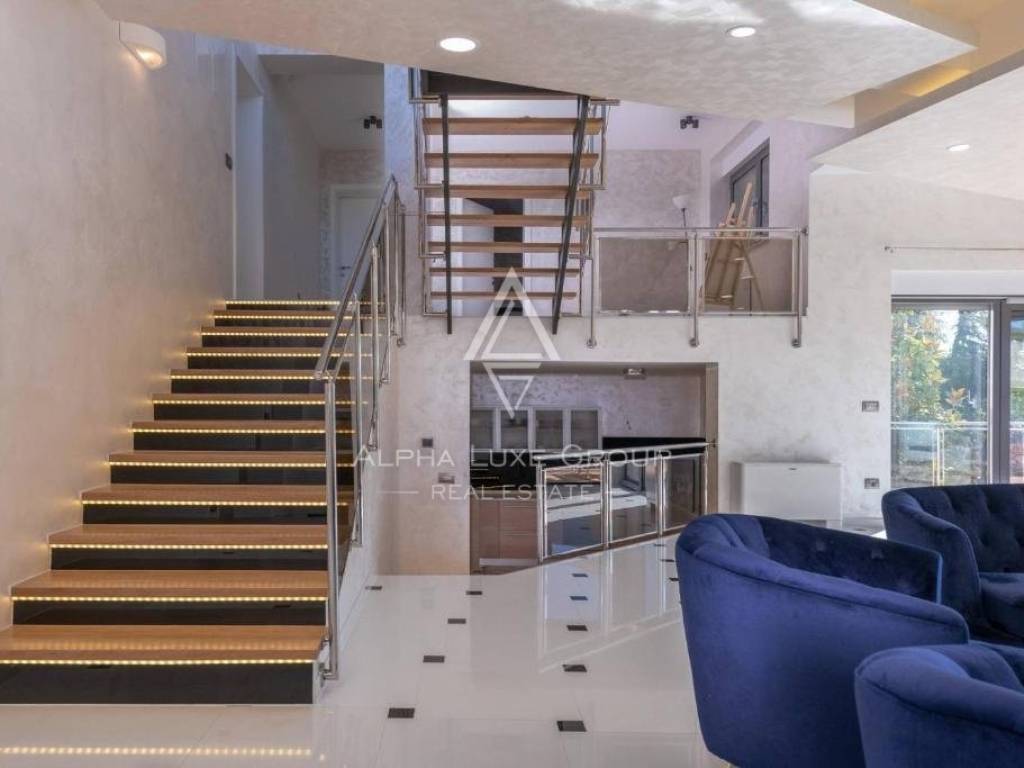A staircase reaches the first floor with a glass railing, Three bedrooms, each with its bathroom, and a spacious terrace with a magnificent view of the olive trees and the sea, which are located on the same level. A distinct home feature is a huge roof terrace with a beautiful sea view.