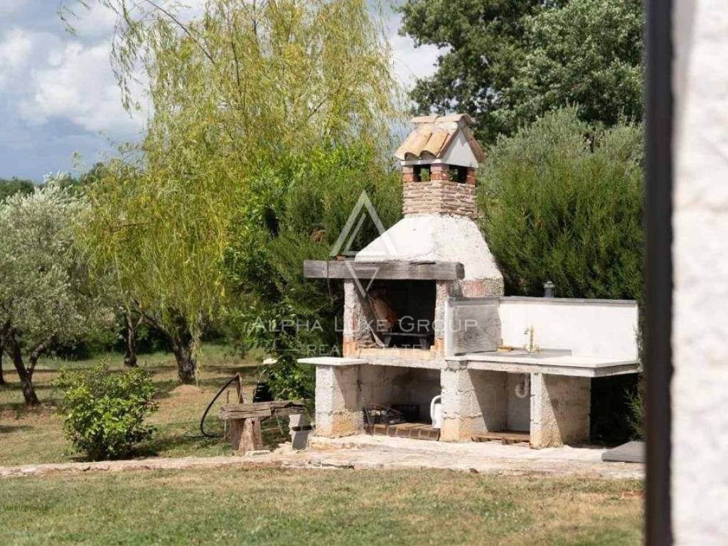 The villa's climate control is efficiently managed through air conditioning units and a cozy solid fuel fireplace in the living space, complemented by solar panel water heating. The garden hosts a 36 sq.m swimming pool with a sun deck, promising unobstructed panoramic views of Višnjan's greenery and the serene olive groves and farmlands that adorn the northwest.