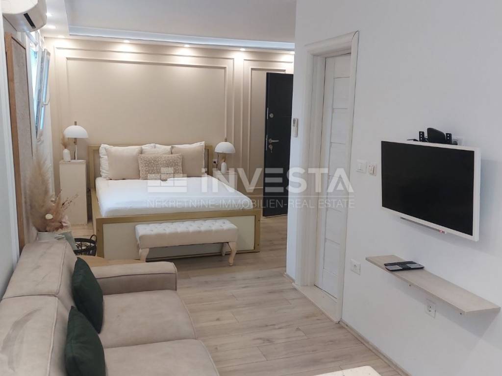 Studio apartment – equipped with a double bed, kitchen with dining area, bathroom, and storage.