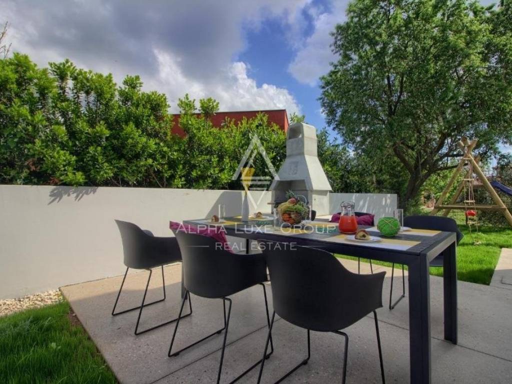 This elegant two-story holiday villa near Pula is now for sale, offering 145 m² of modern living space. The ground floor includes a fully equipped kitchen with a pantry, a dining area, and a spacious living room with a large glass wall that opens to a terrace and pool deck. This level also has a bedroom with an en-suite bathroom and an additional guest bathroom. Upstairs, you’ll find two more bedrooms, each with a private bathroom, and a shared balcony that overlooks the serene surrounding landscape. The property is equipped with underfloor heating powered by a heat pump, along with air conditioning units in every room. The fenced and landscaped yard includes secured parking for three cars, centered around a 29 m² swimming pool with a sun deck, ideal for summer relaxation. The villa’s peaceful location offers a perfect retreat from city life.