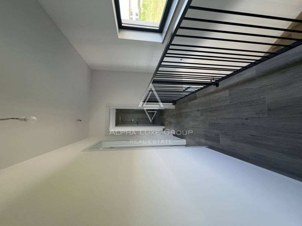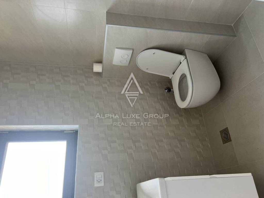 Entering the villa, guests are welcomed into a spacious hallway that leads into a grand open-space area, combining the living room and kitchen. This layout is designed for effortless flow and entertainment. A convenient guest toilet is also located on the ground floor. The upper level is home to three well-appointed bedrooms. The master suite includes a private bathroom and access to a personal terrace, offering a peaceful retreat. An additional bathroom serves the other rooms, each having terrace access, perfect for morning or evening relaxation.