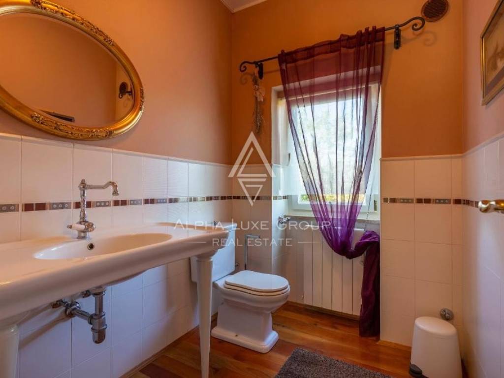 The villa extends across two well-planned levels with a total of seven bedrooms, five full bathrooms and an additional guest toilet. The ground floor features a fully equipped kitchen with a dining area, a bright living room with a fireplace and an additional dining space that opens directly to the poolside terrace. This floor also includes a wine cellar, laundry room and a charming glass-enclosed loggia designed as a serene green corner perfect for morning coffee or afternoon reading.