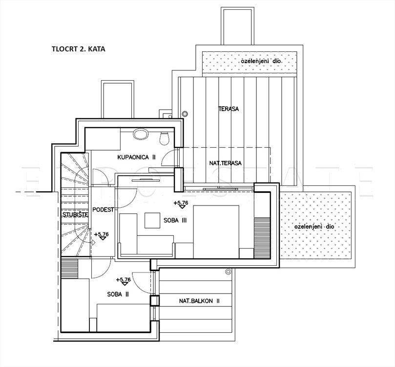 DRUGI KAT: podest, soba 2, soba 3, kupaonica 2, balkon 2