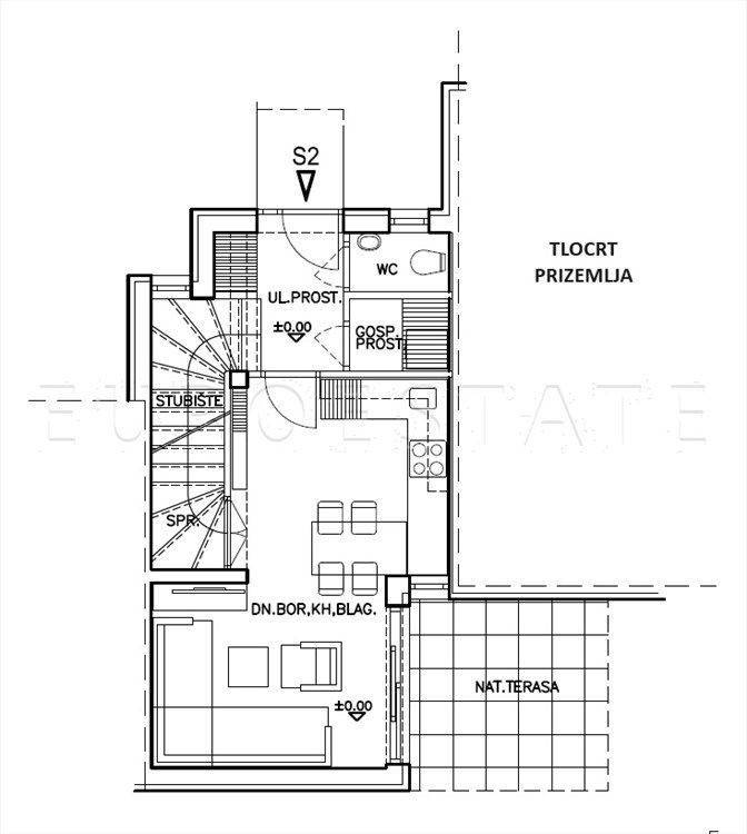 PRIZEMLJE: ulazni prostor, dnevni boravak / kuhinja / blagovaona, WC, prostorija za gospodarstvo, spremište, stubište, natkrivena terasa, vrt