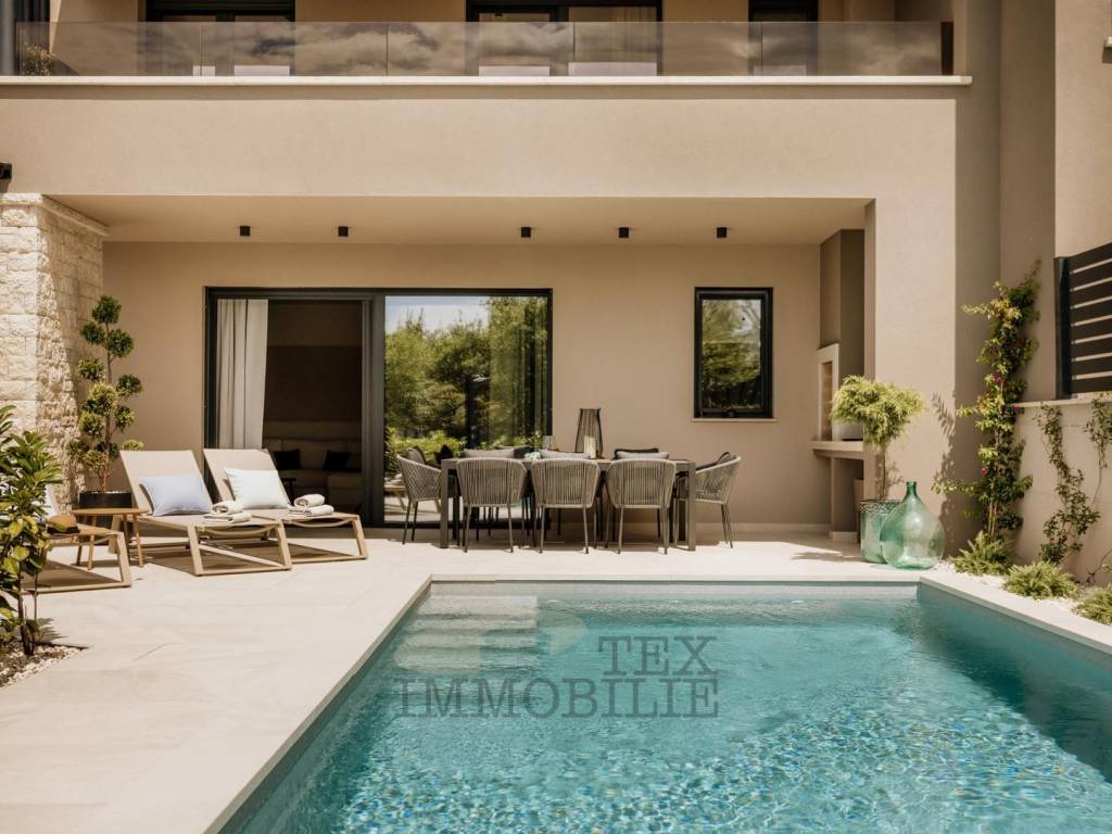 The house consists of an entrance hallway, bathroom, utility room, bedroom, and a spacious living room with a dining area and kitchen with access to the terrace and pool. On the first floor, there are two bedrooms with their own bathrooms and a shared covered terrace. Heating is provided through central underfloor heating with heat pumps, and for cooling, air conditioning units are provided in each room and the living room.